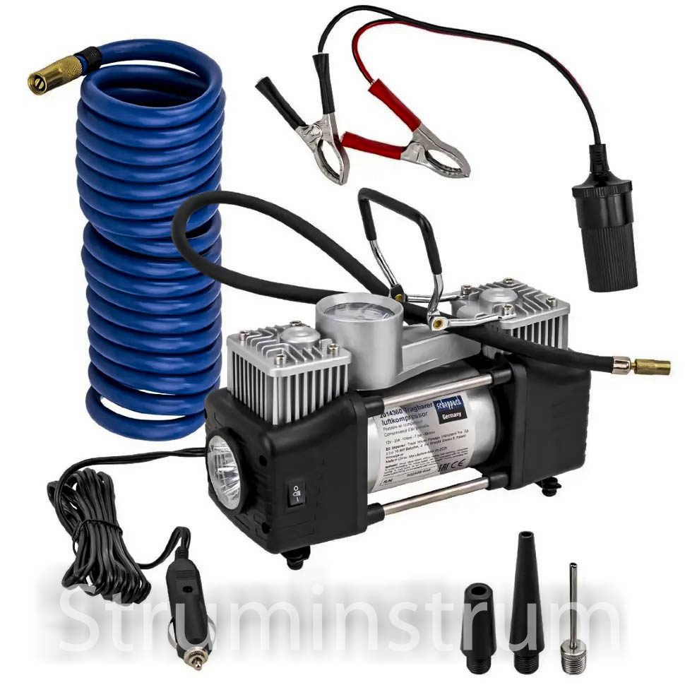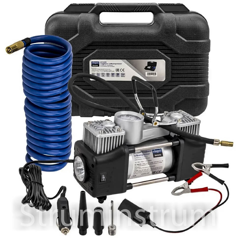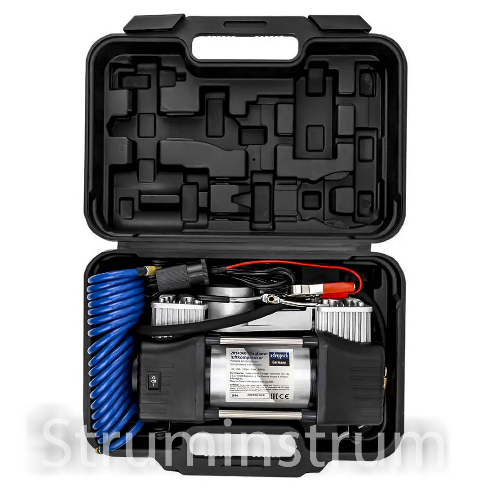 Scheppach SCH-2014360 — автомобільний компресор у міцному кейсі, призначений для швидкого підкачування шин та надувних виробів. Потужний двоциліндровий механізм забезпечує продуктивність 65 л/хв та максимальний тиск 7 бар.