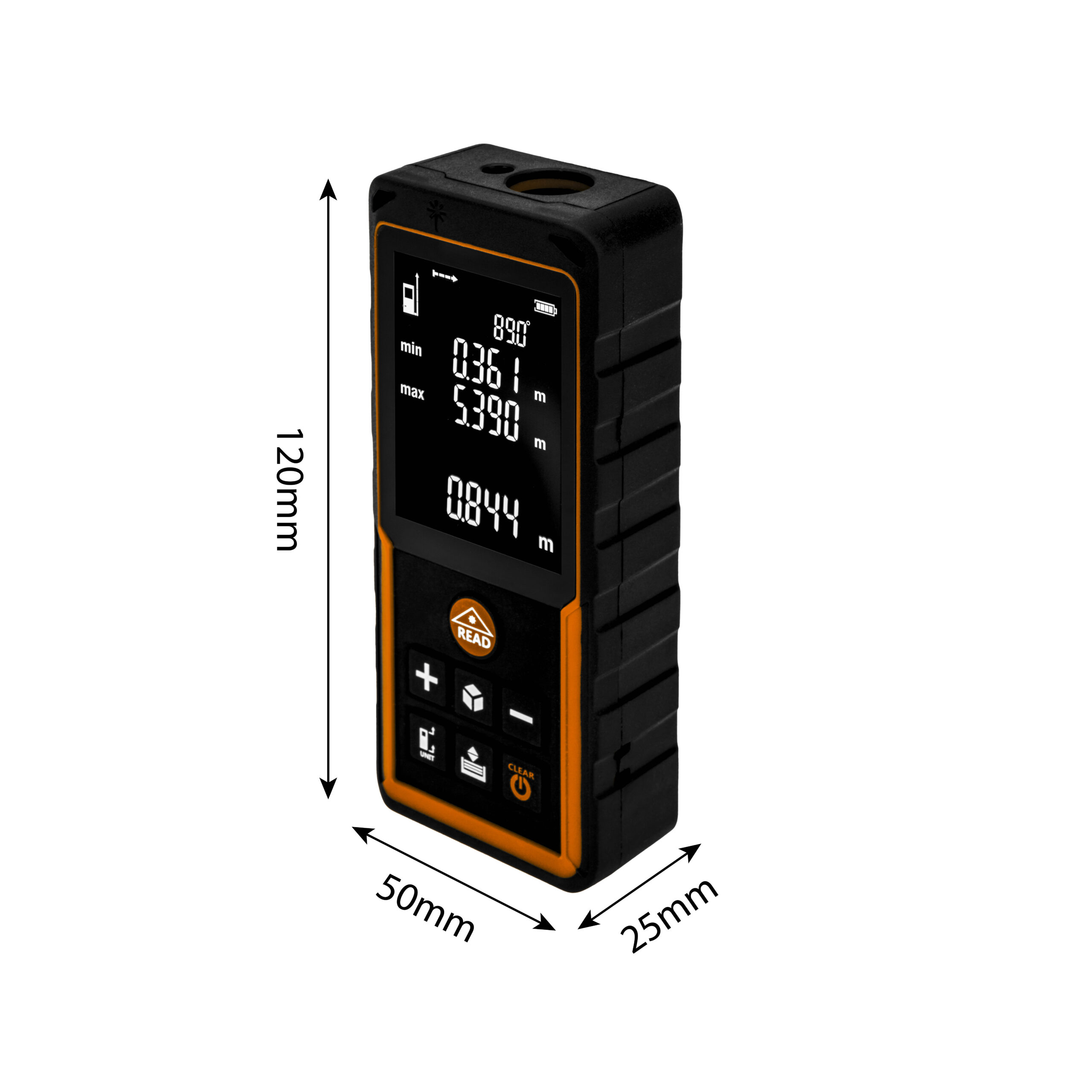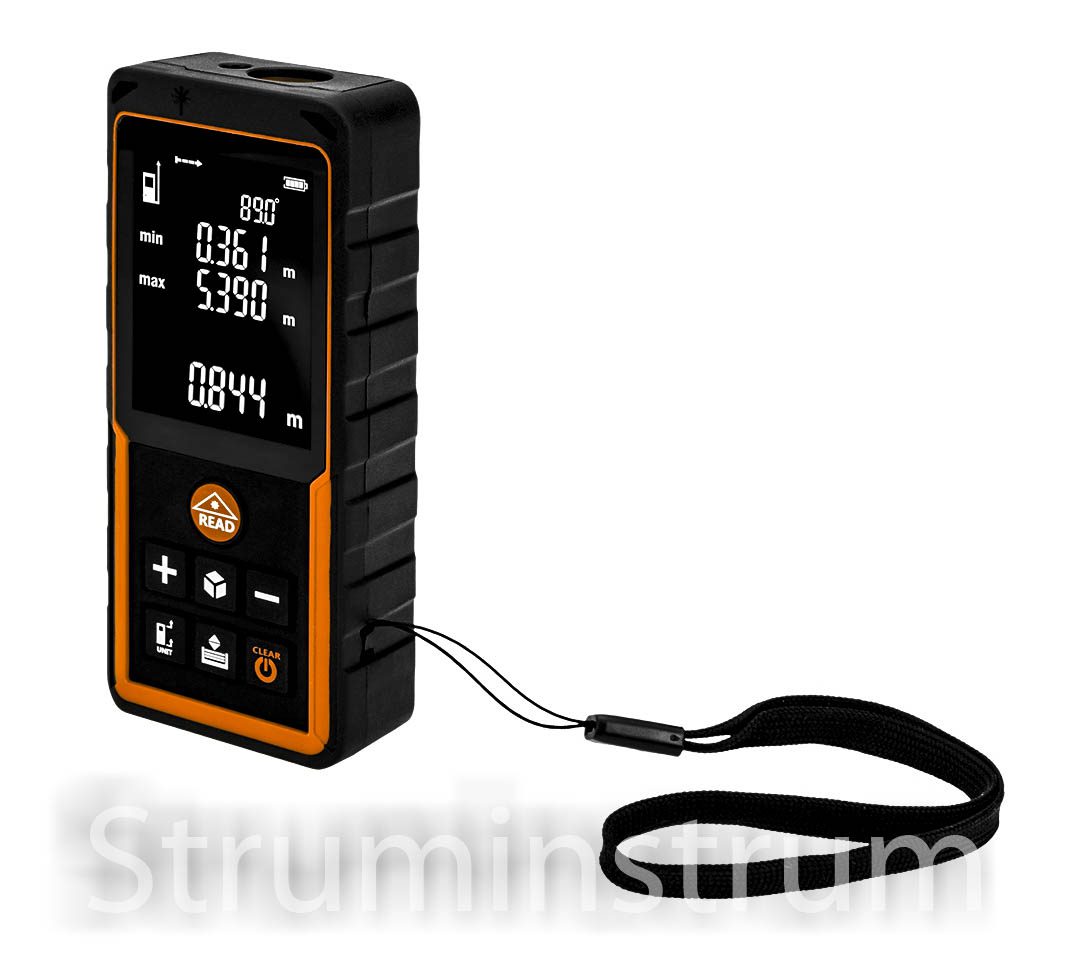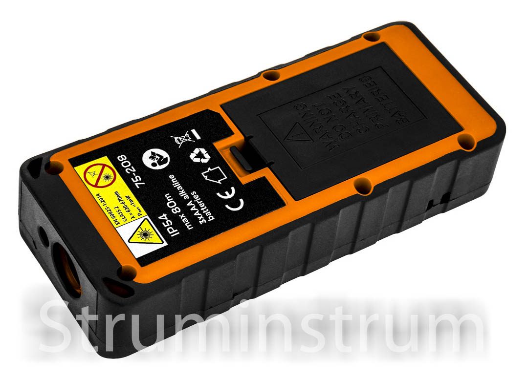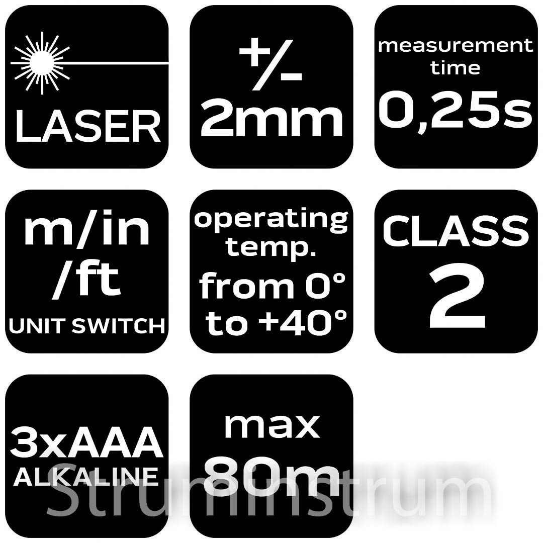 Лазерний далекомір 80 м, IP54, пам’ять 50 вимірювань, функції площа, об’єм, Піфагор, транспортир
