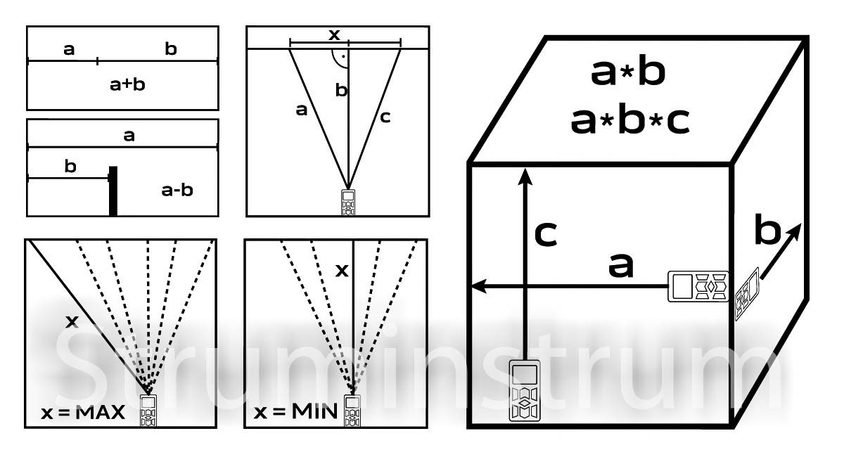 • Функції: відстань, площа, об’єм, безперервне вимірювання, Піфагор, додавання/віднімання, макс./мін. вимірювання