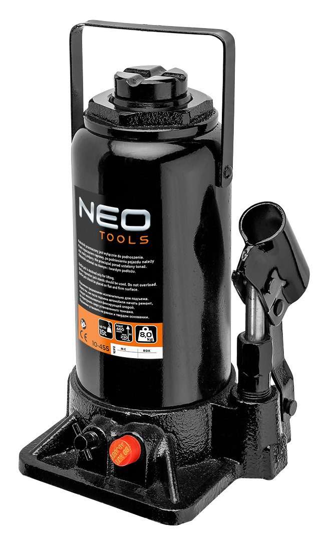 15-тонний стовпчастий підйомник 10-455 компанії NEO виготовлений з міцної сталі з максимальною вантажопідйомністю 15 тонн. Забезпечує можливість підйому від 230 до 460 мм. Він знайде застосування в майстернях, сервісних та транспортних компаніях. Також є відмінним доповненням до гаражного обладнання. Важить домкрат всього 8 кг. Він мобільний і простий у використанні. Відповідність європейським стандартам безпеки забезпечується сертифікатом СЕ. Бренд NEO рекомендується професіоналам.