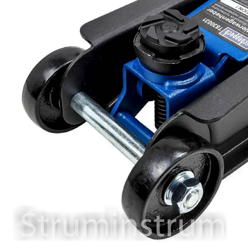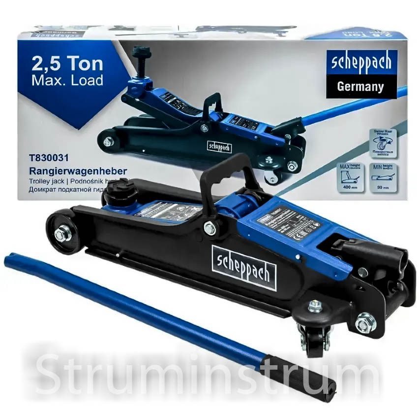 Scheppach SCH-T830031 — професійний низькопрофільний домкрат із вантажопідйомністю 2,5 т. Завдяки мінімальній висоті підхоплення 90 мм він підходить для автомобілів із низьким кліренсом, а максимальна висота підйому 400 мм забезпечує комфортний доступ до днища авто.