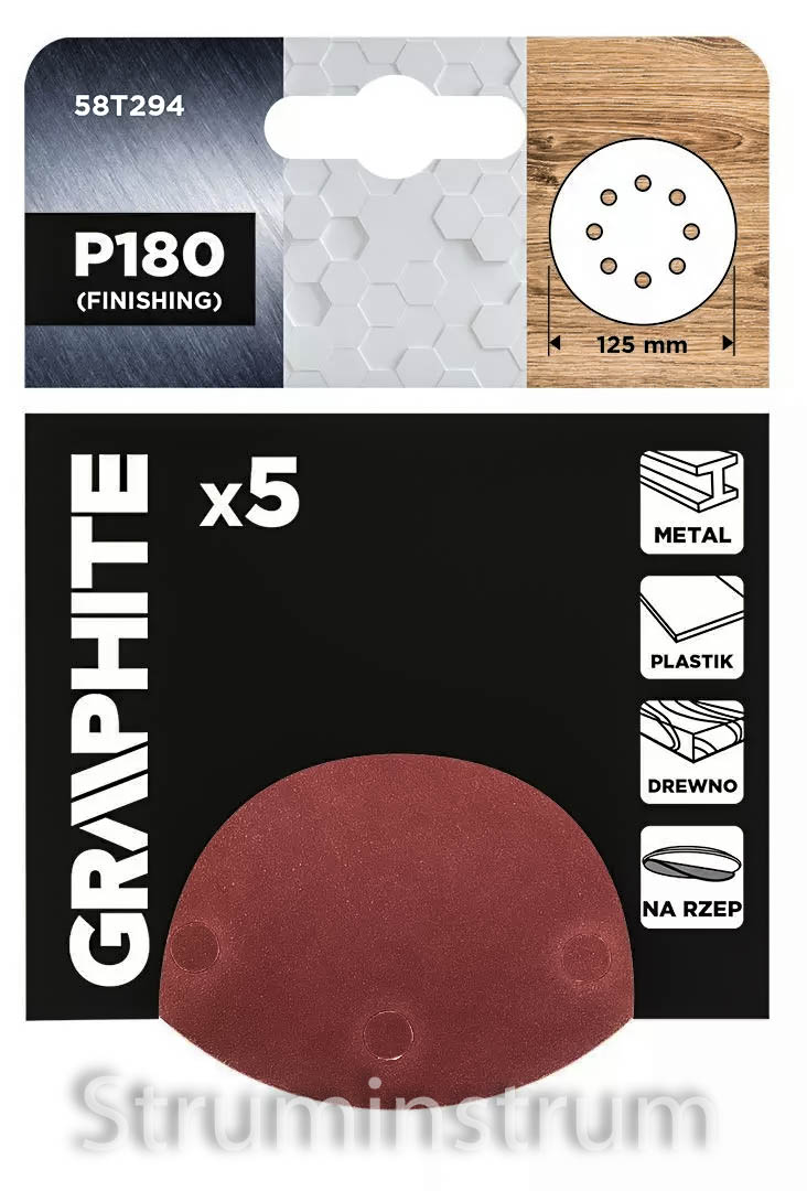 GRAPHITE 58T294 — набір з 5 шліфувальних дисків діаметром 125 мм, призначених для роботи з металом, пластиком та деревом. Оснащені 8 отворами для ефективного відведення пилу та кріпленням на липучці для швидкої заміни.