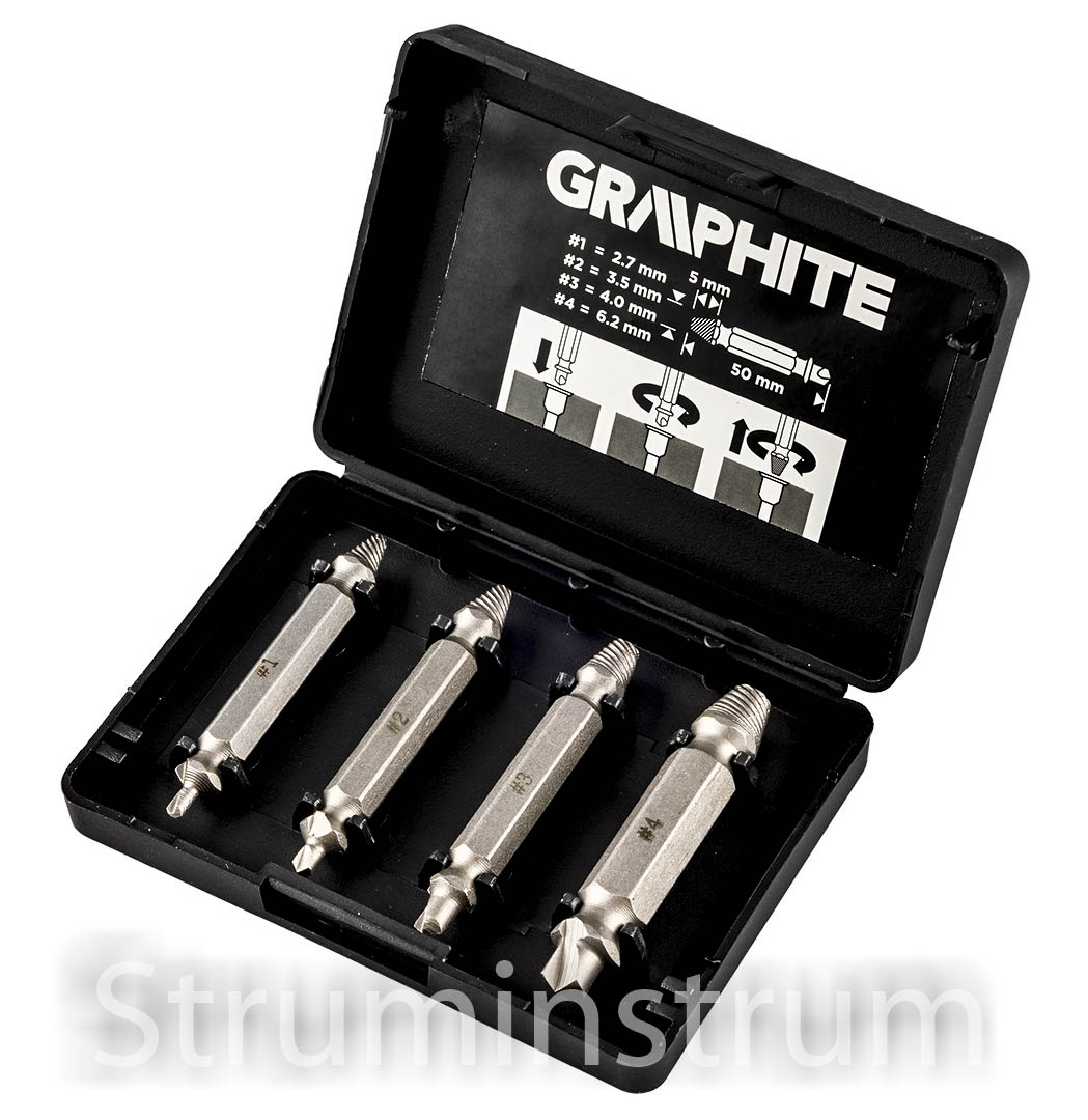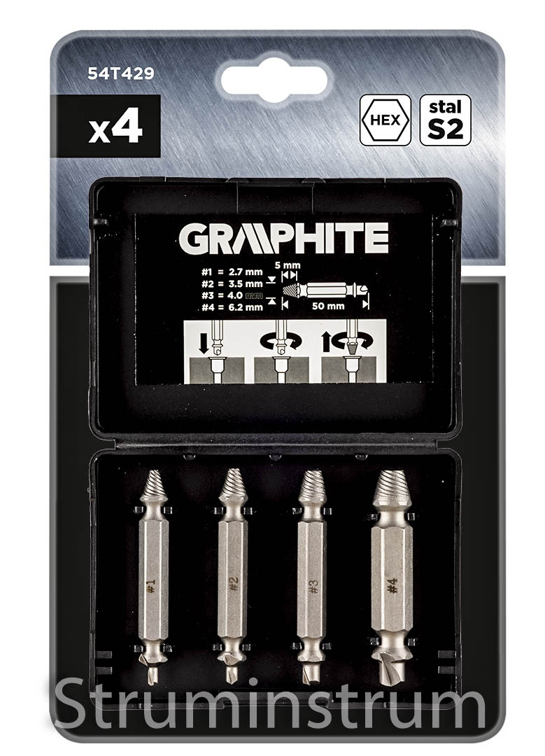 GRAPHITE 54T429 — набір із 4 двосторонніх екстракторів, призначених для викручування зламаних гвинтів або пошкоджених головок. Виготовлені зі сталі S2, вони забезпечують високу міцність та надійність у роботі.