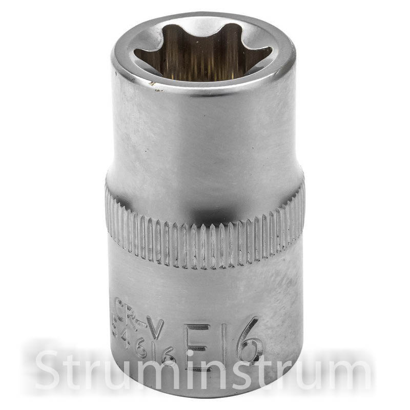 Головка торцева Е-профільна: ідеально підходить для механіків та любителів автомобільного ремонту. Вона забезпечує надійне з'єднання з гвинтами та гайками з профілем "зовнішній торкс" ("зірочка"), а також має оптимальний розмір для роботи у важкодоступних місцях. Головка для використання з ручними інструментами, що дозволяє швидко та ефективно виконувати ремонтні роботи.