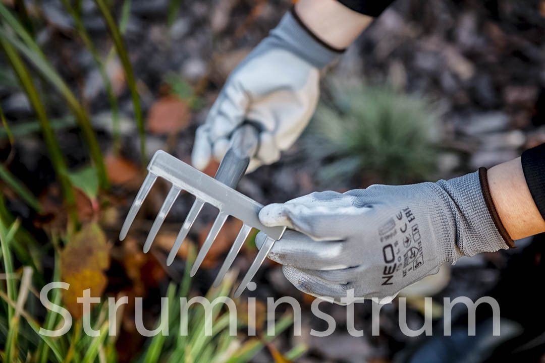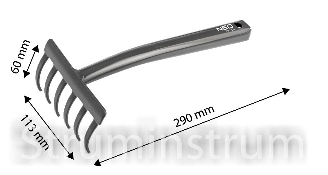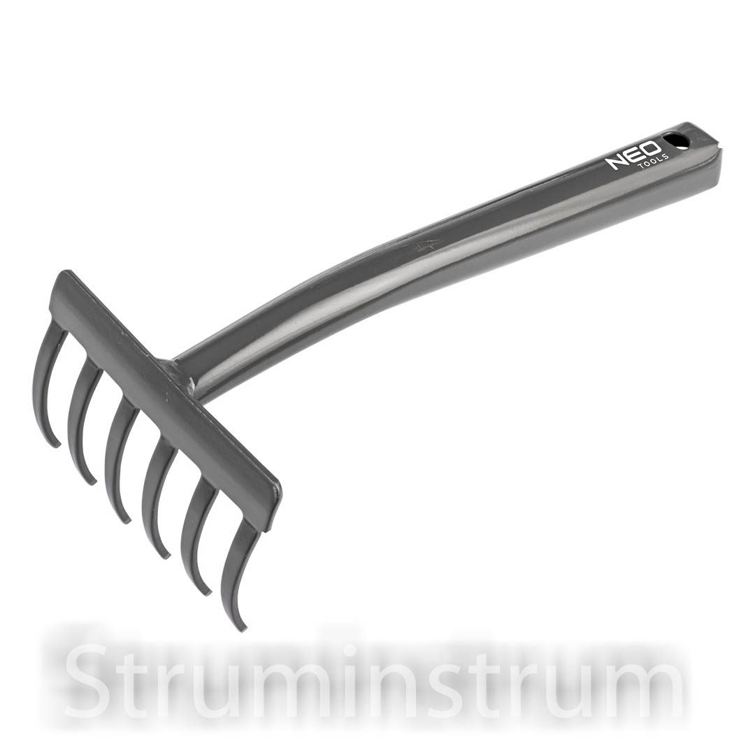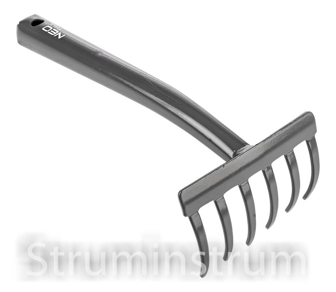 NEO TOOLS 95-024 — компактні граблі зі сталі А3, оснащені 6 міцними зубцями довжиною 6 см. Ідеально підходять для прополювання, згрібання рослинних залишків та інших садових робіт.