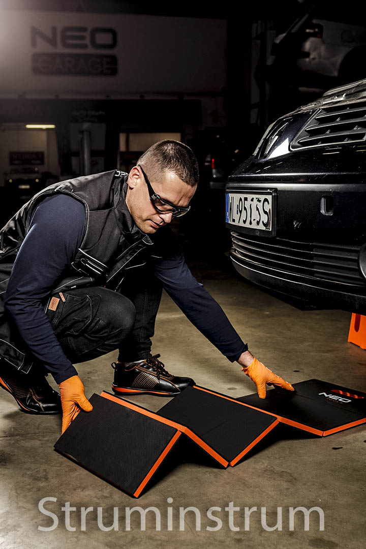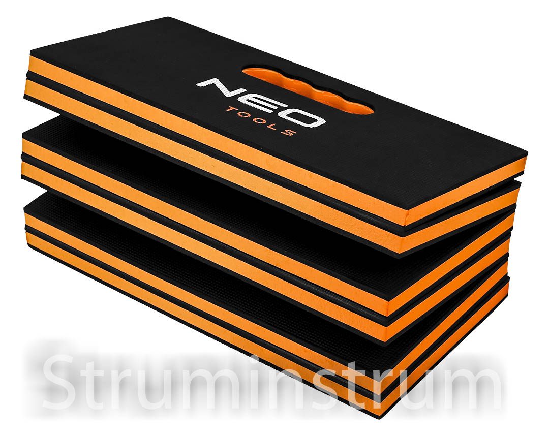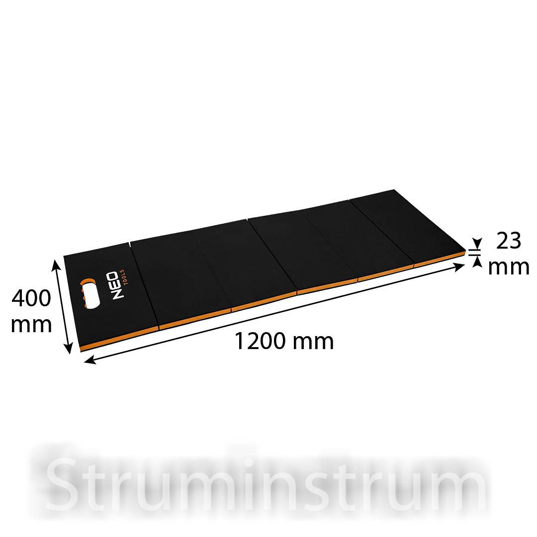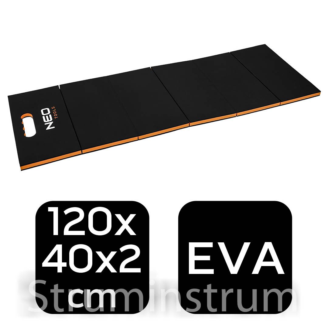 NEO 10-599 — практичний складаний килимок для роботи під автомобілем. Виготовлений із тришарового матеріалу EVA, забезпечує комфорт та захист під час ремонту.