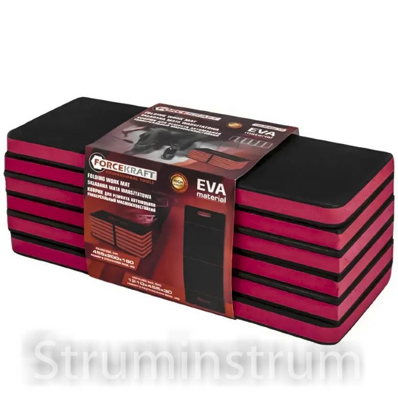 Килимок FORCEKRAFT FK-TRL8002-1B — багатофункціональний складаний килимок-трансформер із матеріалу EVA, розміром 1210×455×30 мм у розкладеному вигляді. Призначений для професійного використання на твердих поверхнях, забезпечує захист і комфорт механіка в різних робочих положеннях.