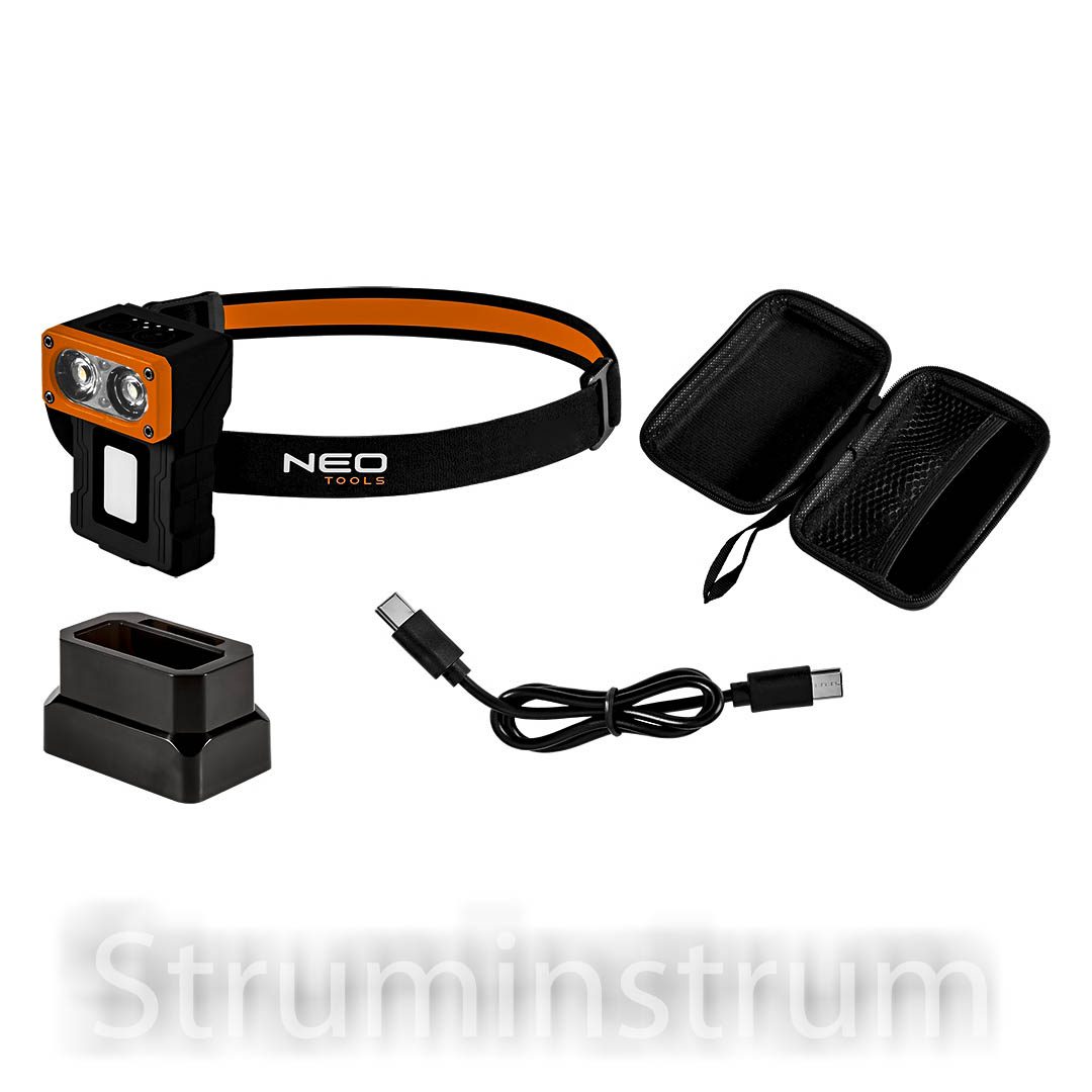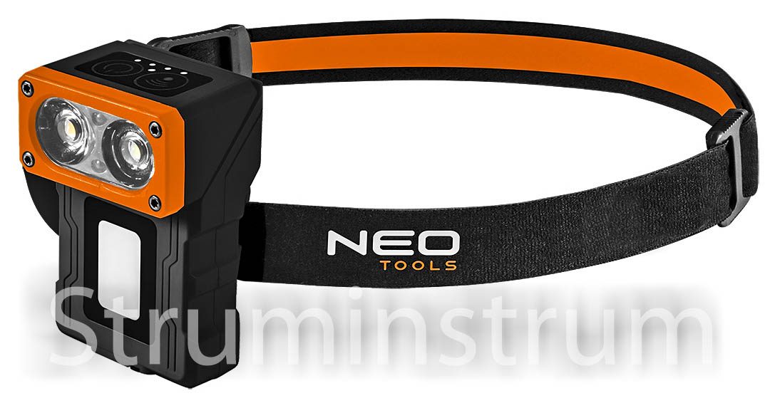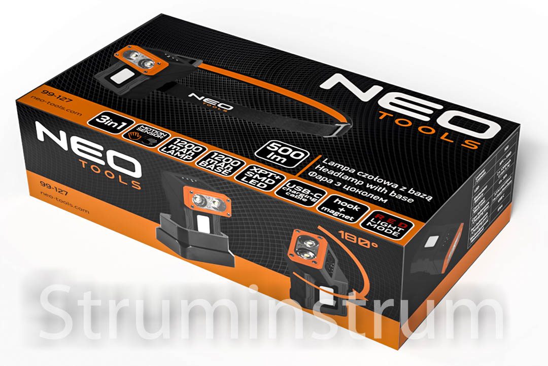 NEO TOOLS 99-127 — багатофункціональний акумуляторний ліхтар з базою та додатковим акумулятором, світлодіодами XPT + SMD, потужністю до 500 лм. Може використовуватися як налобний, ручний або стаціонарний завдяки універсальній конструкції.