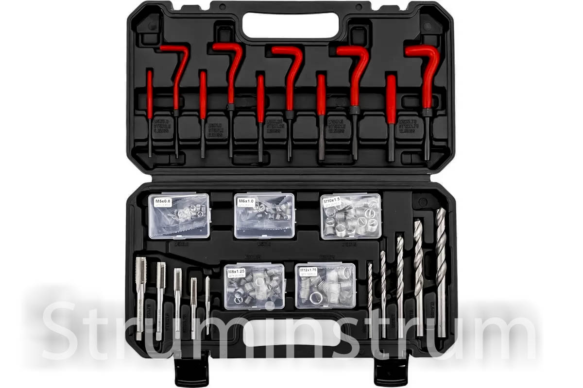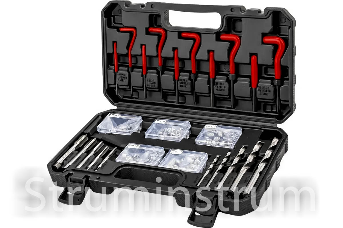 - Комплектність — усі етапи ремонту: свердло, мітчик, інструмент для вставки, вставки, вибивач
