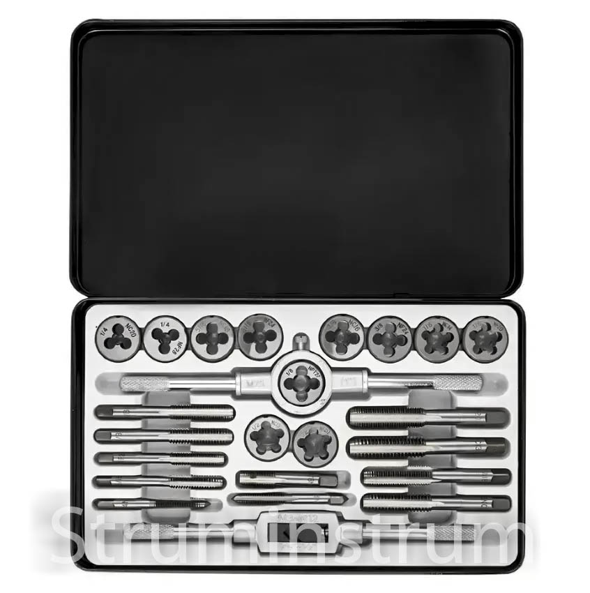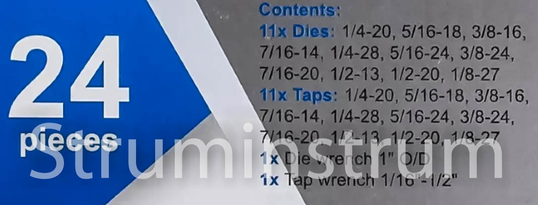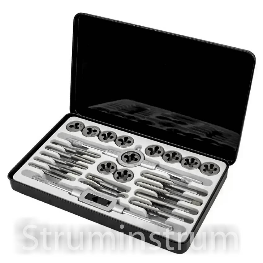- Плашки (11 шт.): 1/8*27, 1/2*13, 1/2*20, 1/4*20, 1/4*28, 3/8*16, 3/8*24, 5/16*18, 5/16*24, 7/16*14, 7/16*20