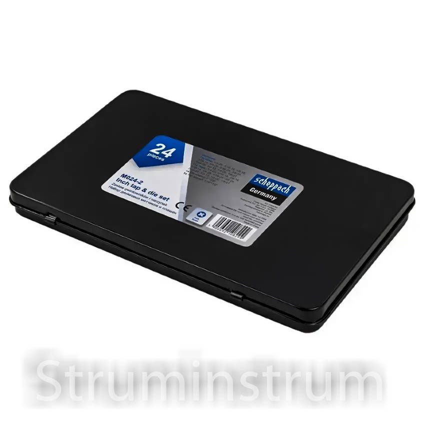 Scheppach SCH-M024-2 — професійний набір для точного нарізання внутрішньої та зовнішньої різьби популярних дюймових стандартів. Усі 24 предмети виготовлені з високоякісної швидкорізальної сталі (HSS), що гарантує міцність, довговічність і стабільну роботу під навантаженням.