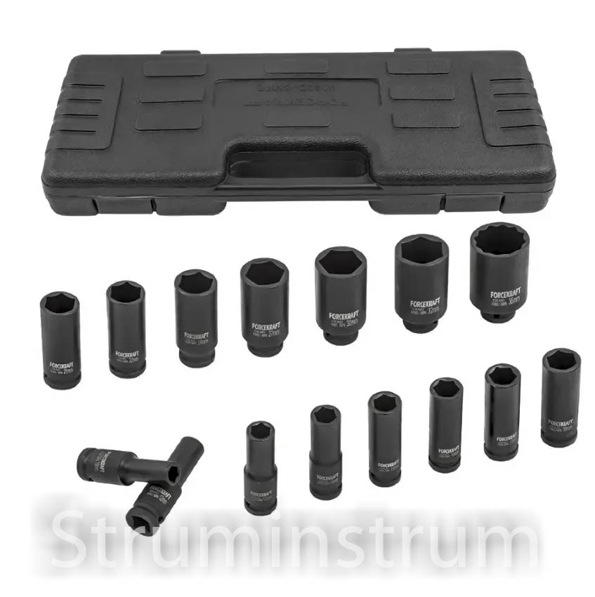 Набір FORCEKRAFT FK-4166D-5MPB — професійний комплект із 15 глибоких ударних торцевих головок із посадковим квадратом 1/2″. Призначений для роботи з ударним інструментом, забезпечує доступ до кріплення на довгих шпильках та у глибоких нішах.