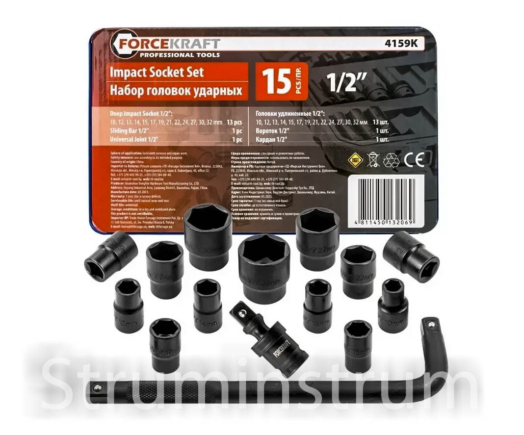 Набір FORCEKRAFT FK-4159K — професійний комплект із 15 ударних торцевих головок із посадковим квадратом 1/2″. Призначений для роботи з ударними пневматичними та електричними гайковертами, забезпечує ефективне відкручування високозатягнутого кріплення.