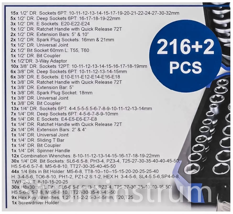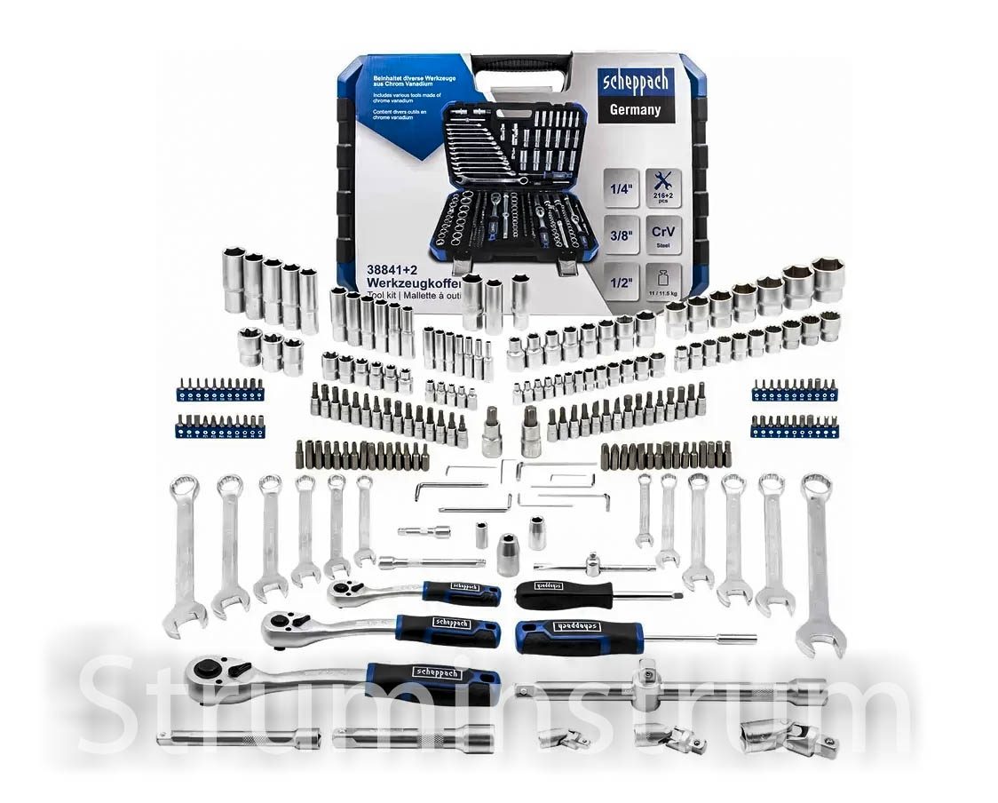 Набір інструментів 216+2 пр. 1/4″, 3/8″, 1/2″ (6гр.) модель Scheppach-38841+2 (59300)
