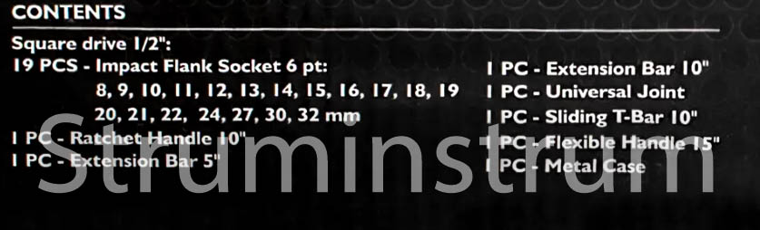 • Головки ударні 6-гранні: 8–32 мм (20 шт): 8, 9, 10, 11, 12, 13, 14, 15, 16, 17, 18, 19, 20, 21, 22, 24, 27, 30, 32 мм