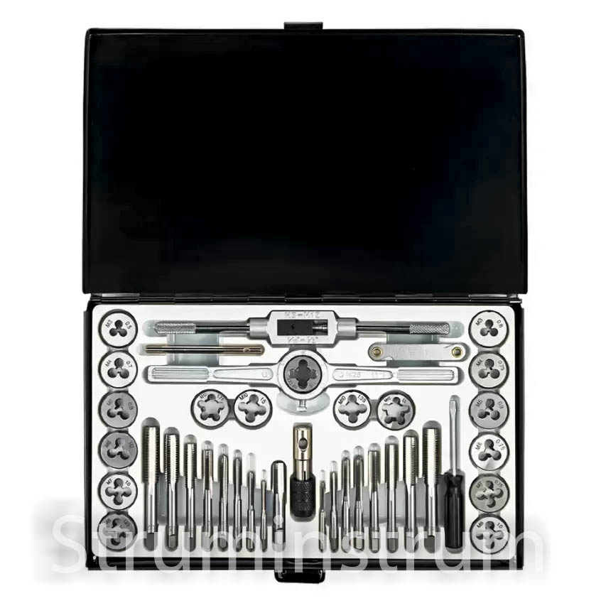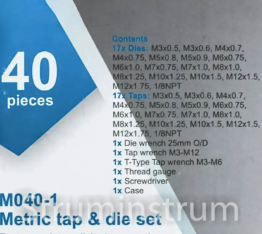 - Мітчики (17 шт.): M3×0.5, M3×0.6, M4×0.7, M4×0.75, M5×0.8, M5×0.9, M6×0.75, M6×1.0, M7×0.75, M7×1.0, M8×1.0, M8×1.25, M10×1.25, M10×1.5, M12×1.5, M12×1.75, 1/8NPT
