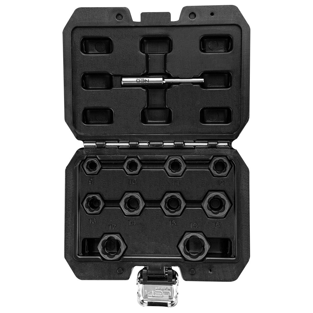 Торцеві головки, для пошкоджених гайок, короткі – набір 11 штук. Набір NEO призначений для відкручування пошкоджених гайок, які неможливо відкрутити звичайним ключем. Внутрішня спіраль автоматично затискає пошкоджений гвинт або гайку, дозволяючи безпечно відкрутити деталь. У комплект входить штопор для зняття гайок з накидного ключа. Набір упакований у футляр для перенесення.