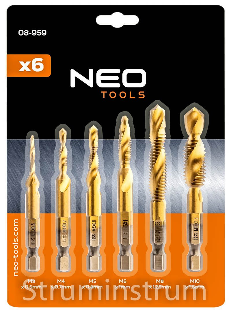 Набір свердел HSS TiN M3-M10, шестигранник 08-959 від NEO TOOLS – це свердла з міцної швидкоріжучої сталі HSS з додатковим покриттям TiN. Вони характеризуються типами різьби: M3 x 0,5 мм, M4 x 0,7 мм, M5 x 0,8 мм, M6 x 1 мм, M8 x 1,25 мм і M10 x 1,5 мм та шестигранним хвостовиком ¼ Hex. Максимальна швидкість обертання досягає 1 000 обертів на хвилину. Діаметри свердел варіюються від 2,5 до 8,5 мм, загальна довжина – від 65 до 71 мм, а довжина нарізної частини – від 10 до 19 мм. Свердла NEO TOOLS рекомендуються в першу чергу для свердління та нарізання різьби в металі. Вони здатні виконувати ці дві функції одночасно, тим самим заощаджуючи час користувача і забезпечуючи кращі результати в роботі. Рекомендується охолодження під час свердління.