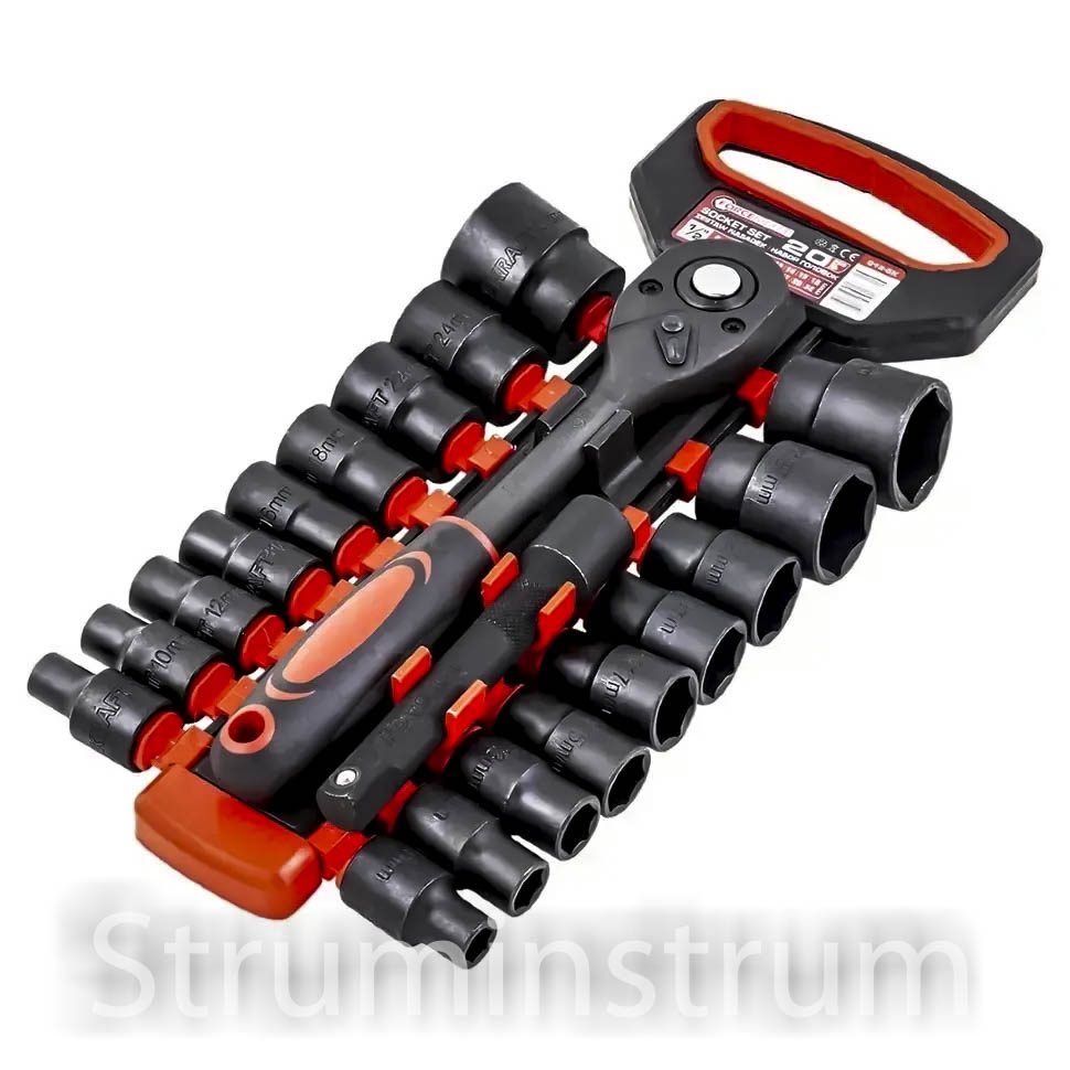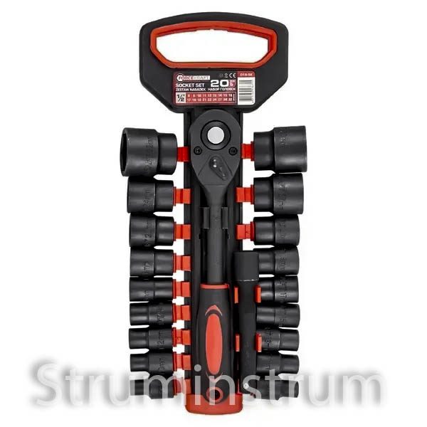 FORCEKRAFT FK-019-5K – професійний набір ударних торцевих головок із тріскачкою, що складається з 20 предметів. Призначений для автомобільних та механічних робіт, забезпечує надійність та довговічність завдяки використанню загартованої сталі.