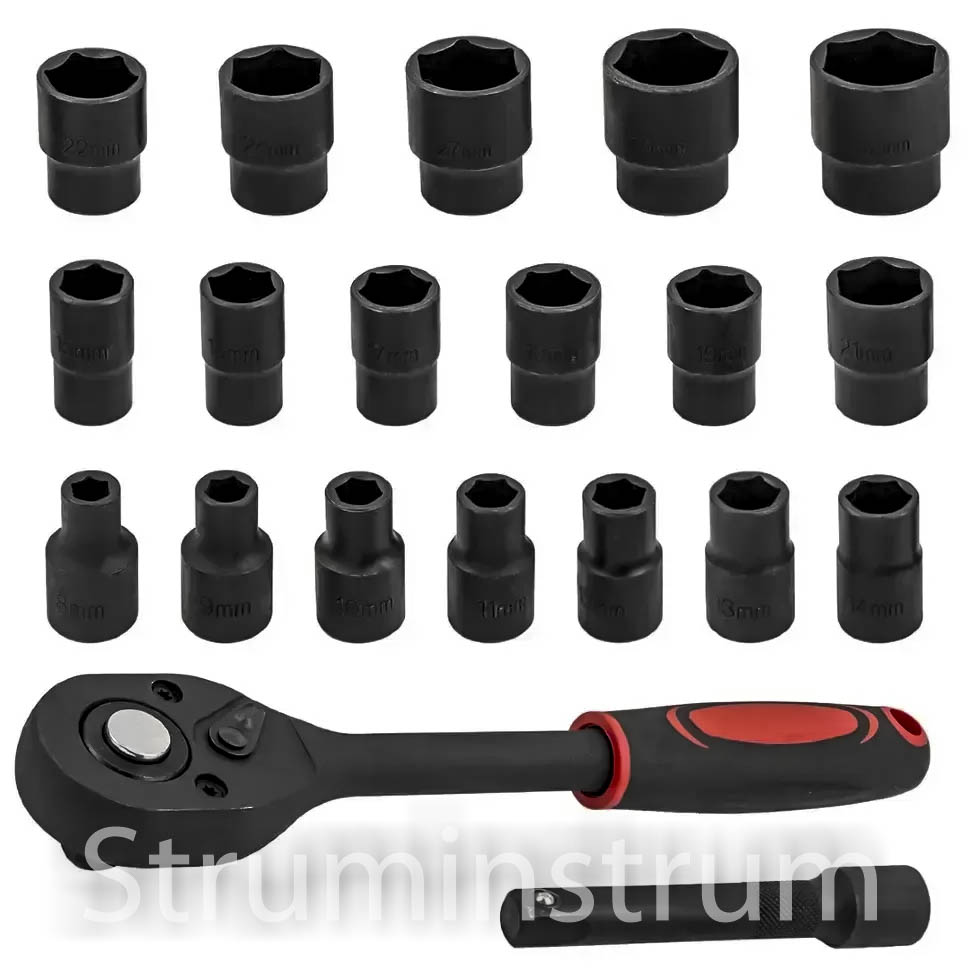 - Торцеві головки 1/2″ (18 шт.): 8, 9, 10, 11, 12, 13, 14, 15, 16, 17, 18, 19, 21, 22, 24, 27, 30, 32 мм