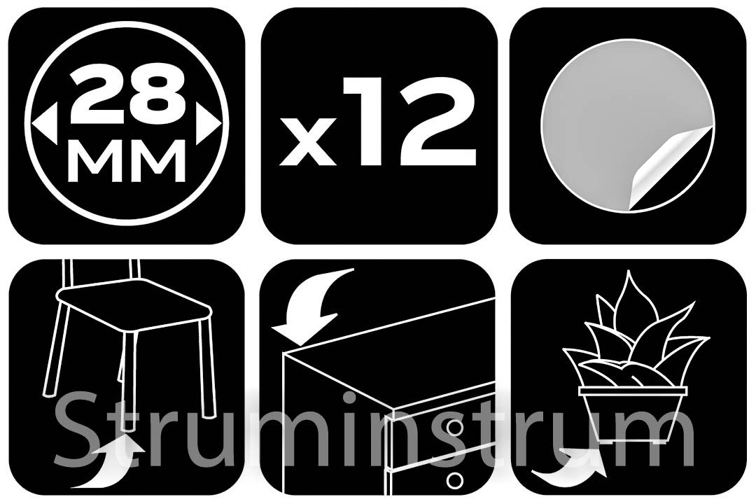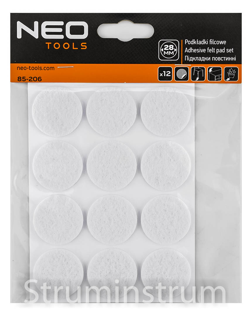 NEO TOOLS 85-205 — самоклеючі круглі фетрові подушечки діаметром 28 мм і товщиною 2,5 мм. У наборі 12 штук білого кольору для захисту підлоги від подряпин та меблів від стирання.