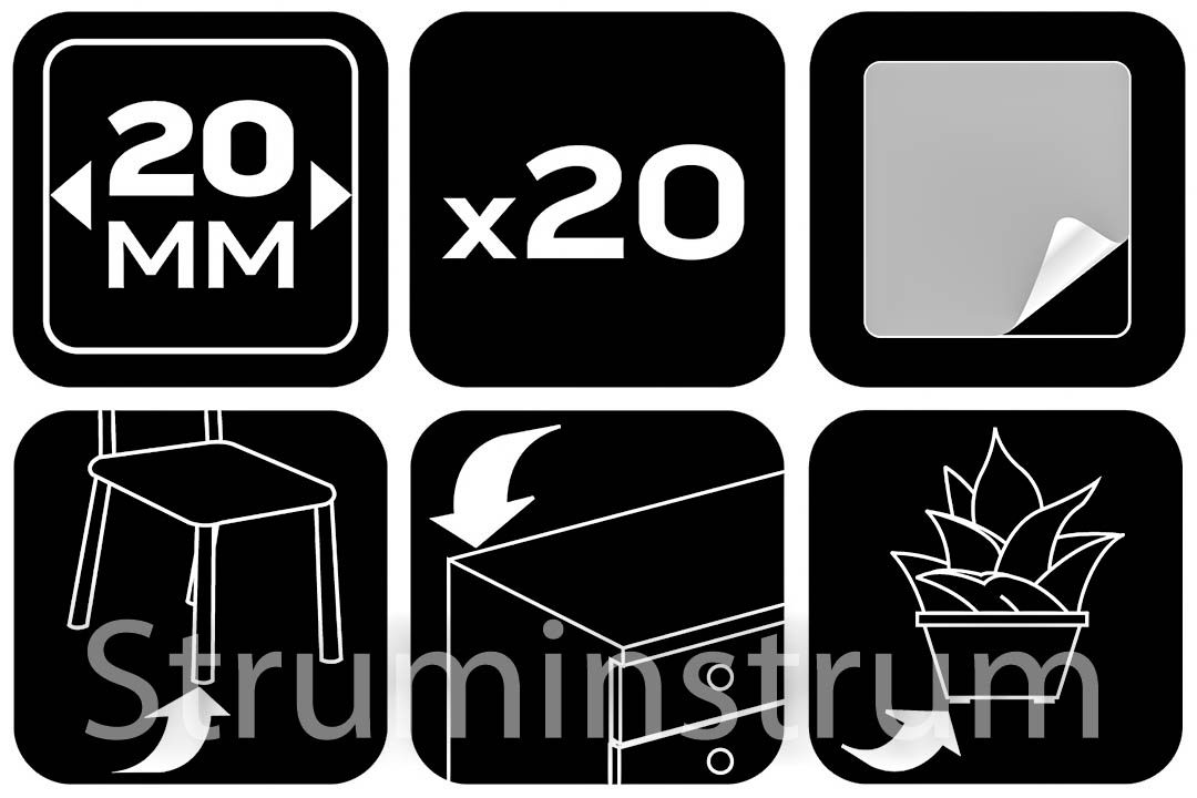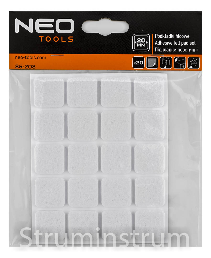 NEO TOOLS 85-208 — самоклеючі квадратні фетрові подушечки розміром 20×20 мм і товщиною 2,5 мм. У наборі 20 штук білого кольору для захисту підлоги від подряпин та меблів від стирання.