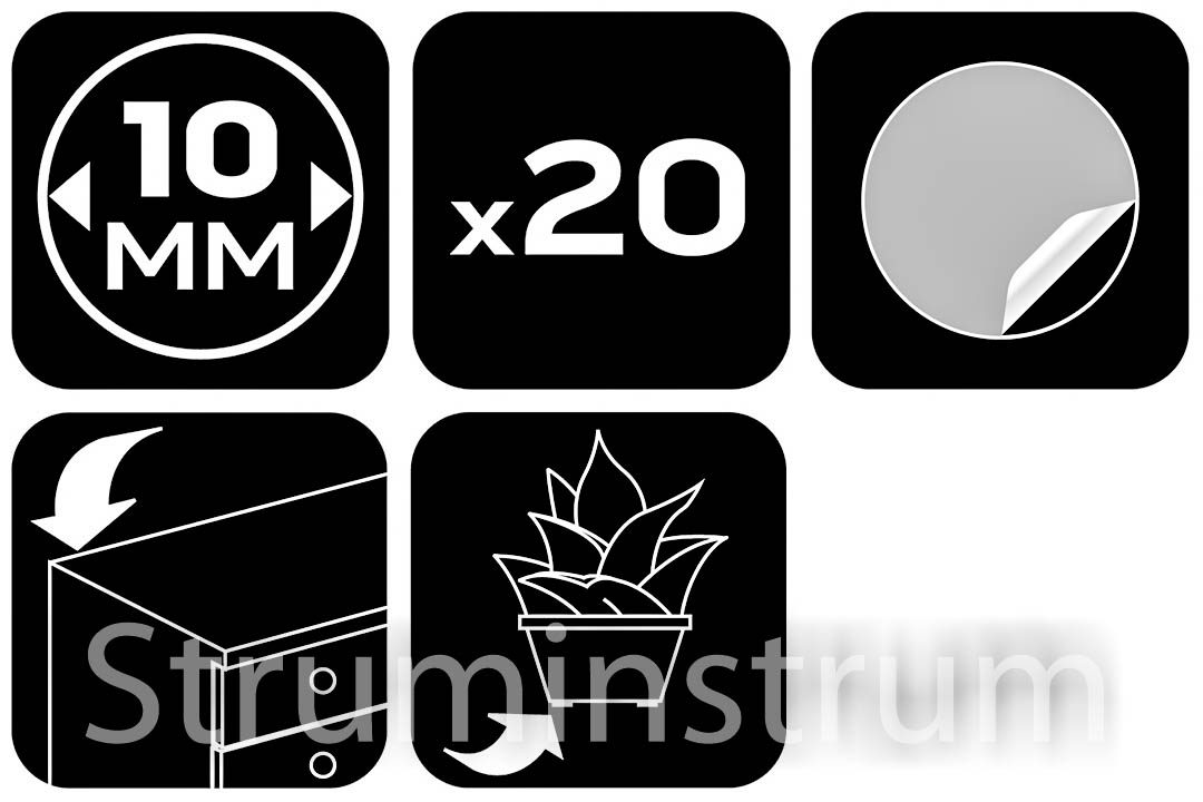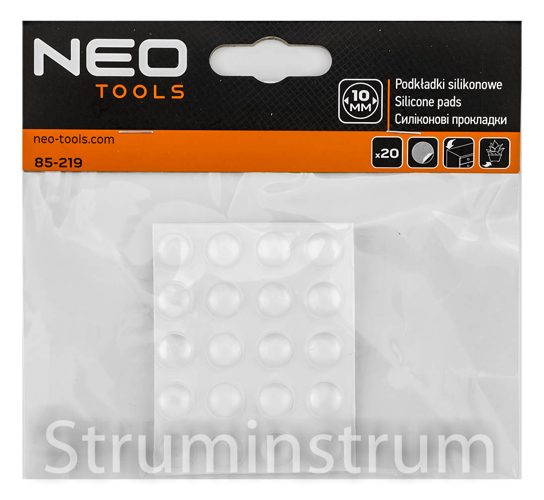 NEO TOOLS 85-219 — самоклеючі круглі силіконові подушечки діаметром 10 мм і товщиною 2 мм. У наборі 20 прозорих накладок для захисту меблів, підлоги та стін від подряпин, ударів і вм’ятин.