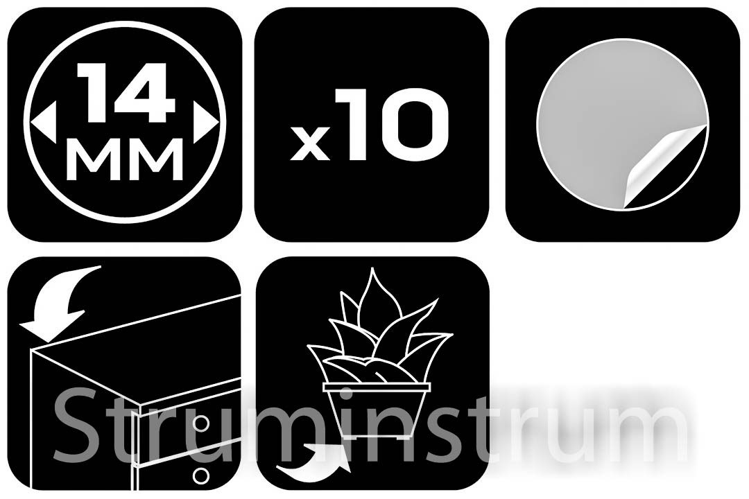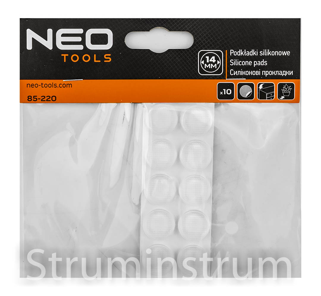 NEO TOOLS 85-220 — самоклеючі круглі силіконові накладки діаметром 14 мм і товщиною 6 мм. У наборі 10 прозорих шайб для захисту меблів, підлоги та стін від подряпин, ударів і шуму.
