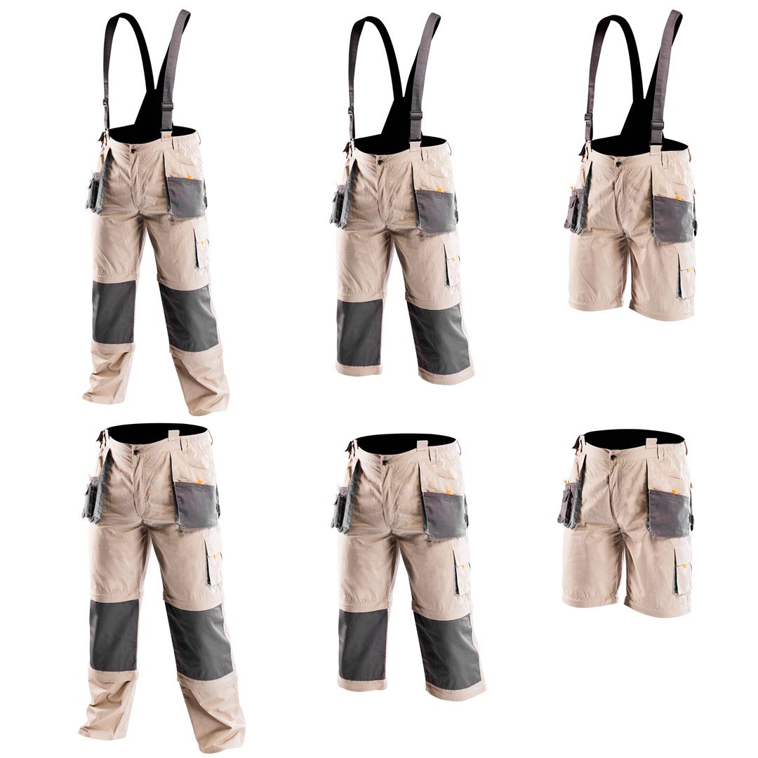 Штани робочі 6 в 1 NEO ― це інноваційне рішення, що дозволяє модифікувати його на різні варіанти: штани можна використовувати як власне штани, на шлейках або без, та у трьох варіантах довжини: довгі, шорти та 3/4. Завдяки цьому, незалежно від умов праці, комфорт користувача залишається на високому рівні. Виготовлені з високоякісного матеріалу, зміцненого у місцях підвищеного зношування. Добротні кишені витримують навіть велике навантаження та дозволяють зберігати весь необхідний під час праці інструмент. Дихаючий матеріал ― це перевага, що забезпечує високий рівень зручності одягу. Гарантією якості є європейський сертифікат та виготовлення згідно зі стандартом EN ISO 13688:2013. Марка NEO відповідає очікуванням професіоналів.