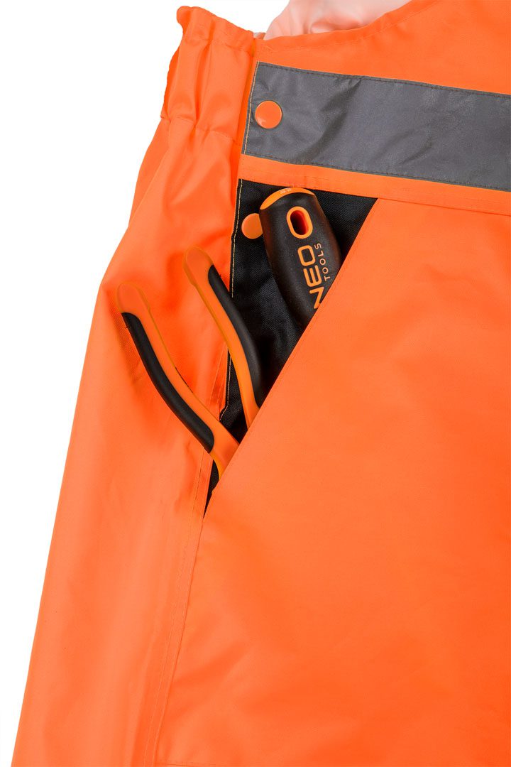 Комбінезон робочий NEO (81-776-S) підвищеної видимості ― це практичне рішення, яке підвищує безпеку користувача шляхом сигналізації про його наявність за будь-якого освітлення як у денний час, так і у нічний за умови штучного освітлення, напр., фарами транспортних засобів. Виготовлений із високоякісної поліестерної тканини типу Oxford. Водовідштовхувальність забезпечується поліуретановим шаром, натомість застосування дихаючого матеріалу підвищує комфорт експлуатації. Гарантією якості є європейський сертифікат CE та виготовлення згідно з нормою EN ISO 13688:2013. Марка NEO відповідає очікуванням професіоналів.