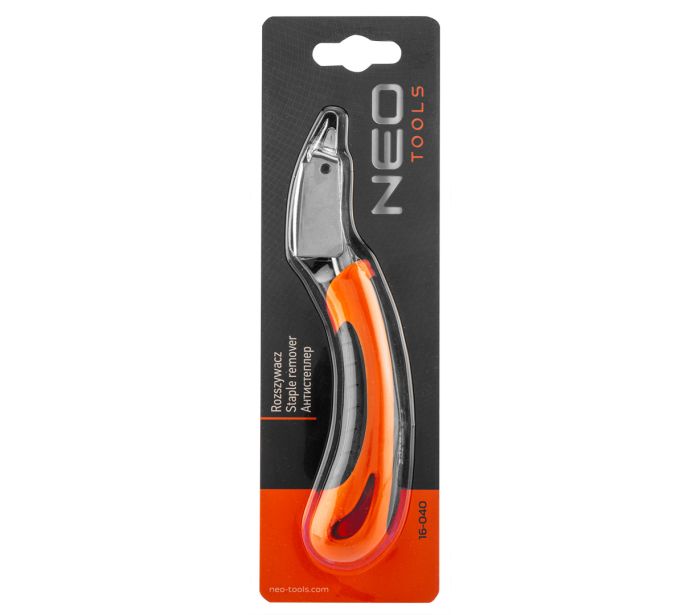 NEO (арт. 16-040) – незамінний інструмент в кожній оббивній майстерні, а також при роботі зі скобами. Ефективно видаляє скоби з дерева, килимів, текстилю, ДВП та інших матеріалів. Дозволяє видаляти скоби безпечним для поверхні, на якій вони були закріплені, способом. Призначений для роботи зі скобами від 6 до 10 мм.