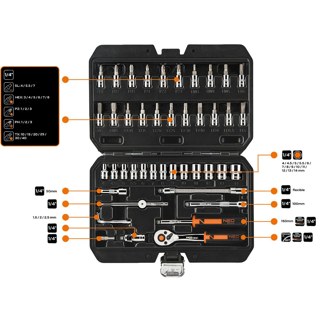 Neo Tools Набір інструментів, Набір торцевих головок, 46шт, 1/4", CrV, кейс