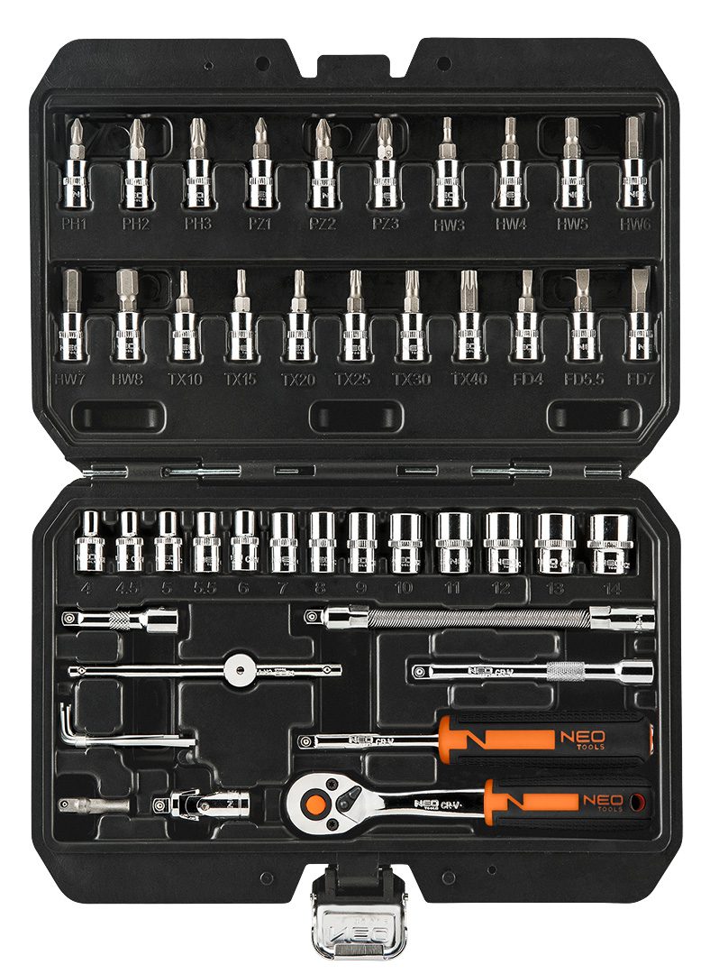 Набір торцевих ключів 1/4" NEO складається з 46 елементів, виготовлених із високоякісної хромванадієвої сталі. До складу набору входить тріскотка, що характеризується западковим (храповим) механізмом (90 зубці) із подовженим ресурсом. Набір містить багатий вибір насадок (розмірами від 4 до 14 мм) і викруткових наконечників (пласкі, хрестовидні, шестигранні, Torx).