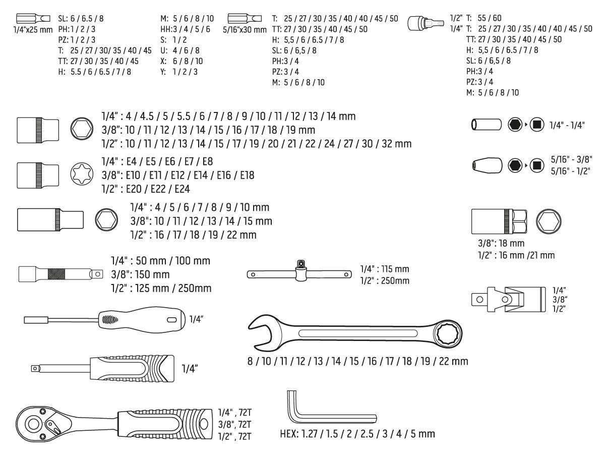 | Комплектація | торцеві головки/(3/8" Torx, розміри: E10, E11, E12, E14, E16, E18; довгі, розміри: 10, 11, 12, 13, 14, 15; розміри: 10, 11, 12, 13, 14, 15, 16, 17, 18, 19; для свічок: 18 мм; 1/4" Torx, розміри: E4, E5, E6, E7, E8; довгі, розміри: 4, 5, 6, 7, 8, 9, 10; розміри: 4, 4.5, 5, шестигранні / зіркоподібні ключі/(1.27, 1.5, 2, 2.5, 3, 4, 5 мм), подовжувач/(1/4" 2 шт: 50 мм і 100 мм; 1/2” 2 шт: 125 мм і 250 мм; 3/8", 150 мм), вороток/(1/2"), перехідник/(1/2", для змінних наконечників 5/16"; 3/8", для змінних наконечників 5/16"), шарнір/(1/4"), змінні наконечники/(1/4" 25 мм: M5, M6, M8, M10; H3H, H4H, H5H, H6H; S1, S2; 4, 6, 8; (X) 6, 8, 10; (Y) 1, 2, 3; SL6, SL6.5, SL8, PH1, PH2, PH3, PZ1, PZ2, PZ3, H5.5, H6, H6.5, H7, H8, T25, T27, T30, T35, T40, T45, T27H, T30H, T35H, T40H, T45H; 5/16" 30 мм: SL6, SL6.5, SL8,, ключ тріскачковий/(1/4", 72 зубца; 1/2", 72 зубца; 3/8", 72 зубца), рожково-накидні ключі/(8, 10, 11, 12, 13, 14, 15, 16, 17, 18, 19, 22 мм), перехідник для наконечників, рукоятка/(1/4") |