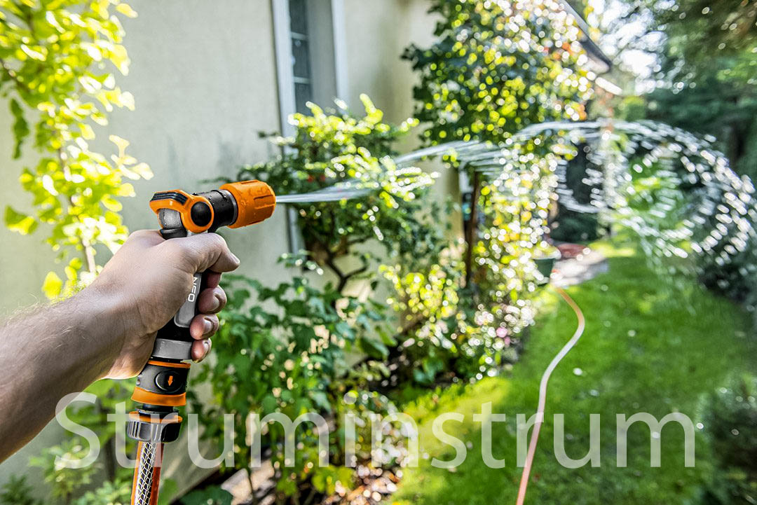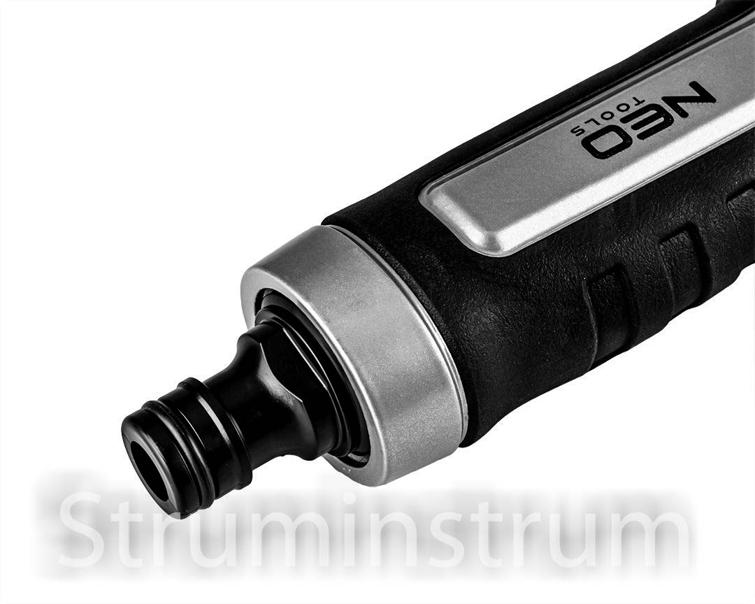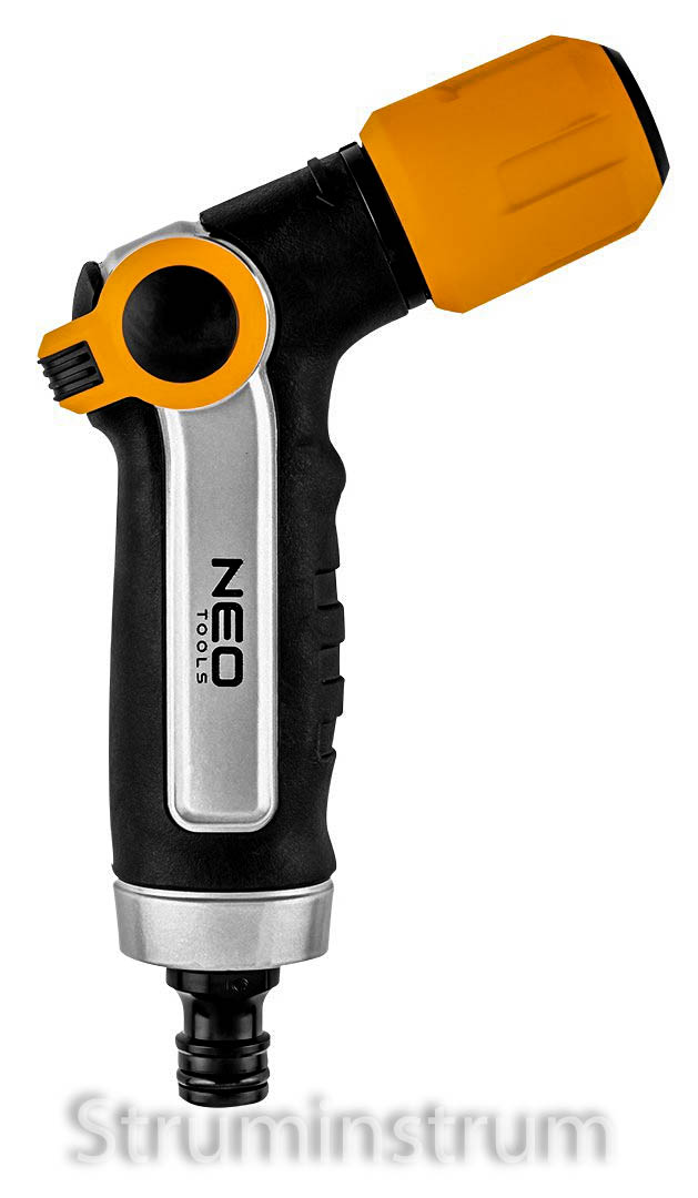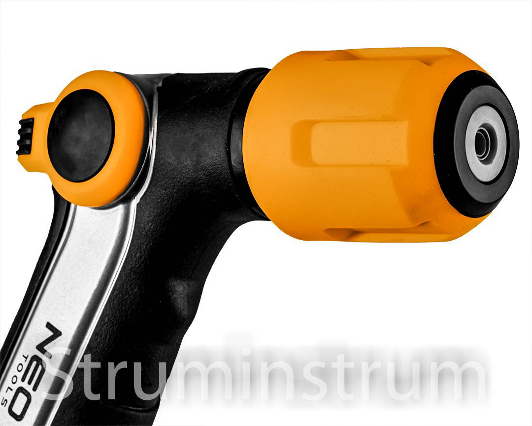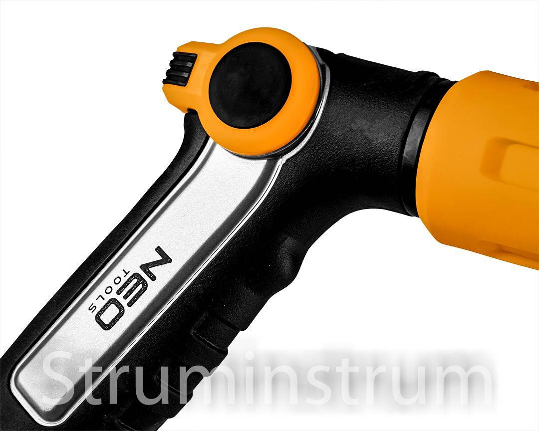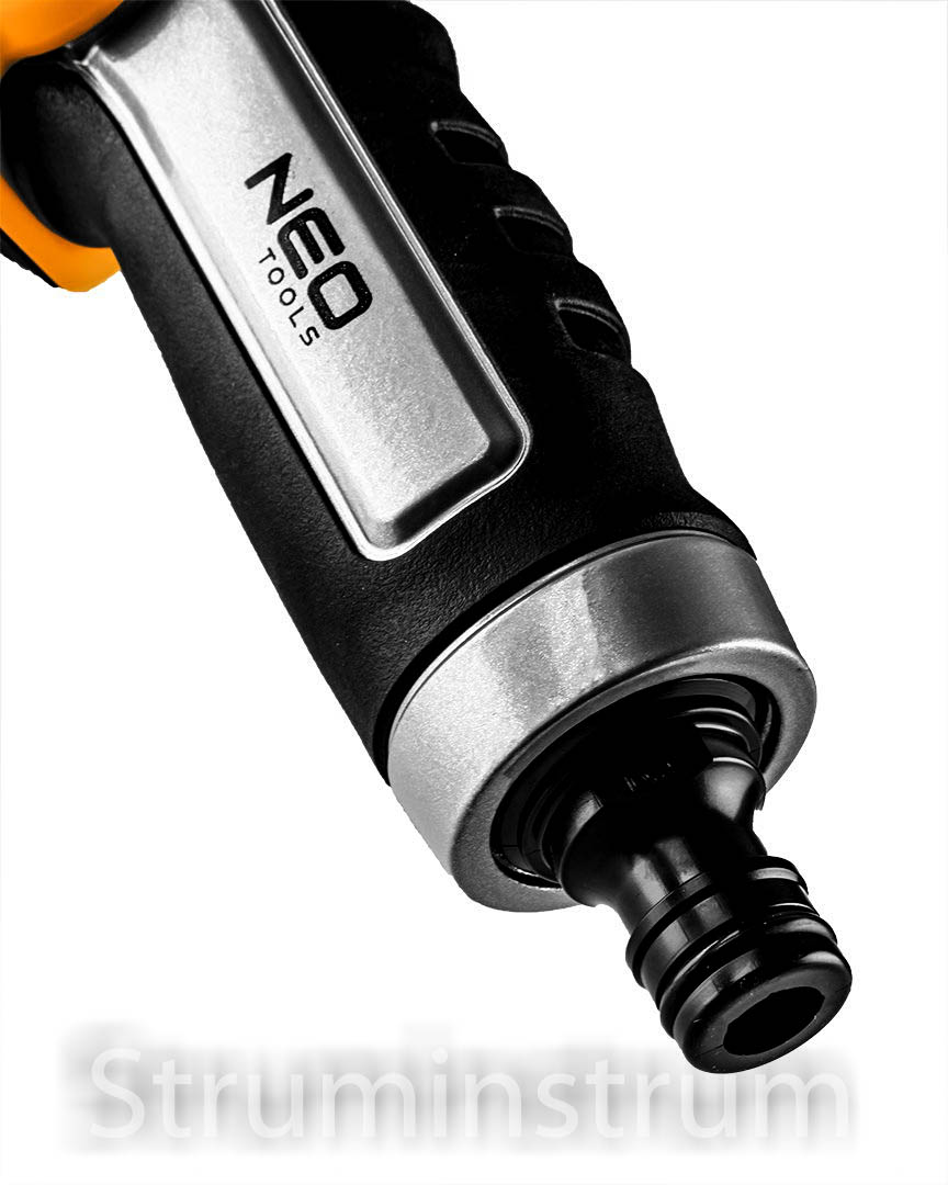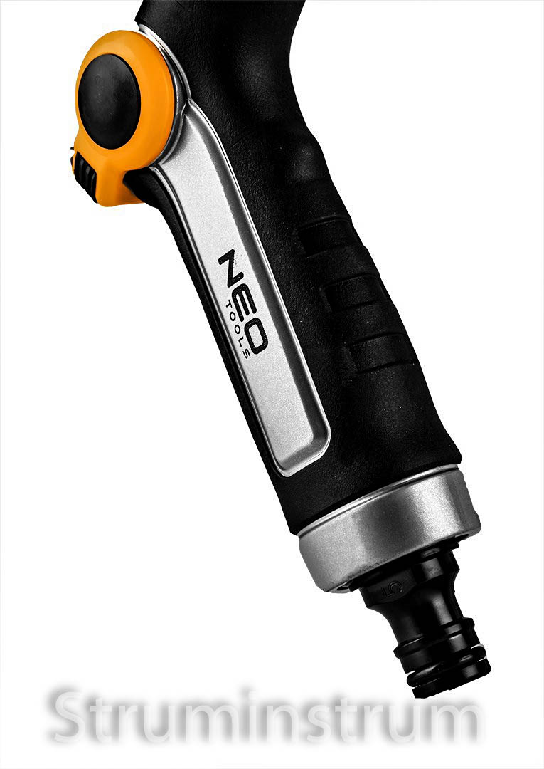 Пістолетний дощувач NEO, розгорнутий струмінь (арт. 15-707) призначений, в тому числі, для поливу газонів. Він оснащений 2 функціями поливу, які дозволяють регулювати типи розпилення відповідно до ваших потреб: сильне точкове розпилення, розсіяне "циклонне" розпилення. Розпилювач оснащений блокуванням увімкнення/вимкнення великим пальцем, що дозволяє використовувати його в безперервному режимі. Рукоятка ергономічної форми добре лежить в руці і не вислизає, підвищуючи комфорт. Внутрішня конструкція дощувальної машини виконана з цинкового сплаву.