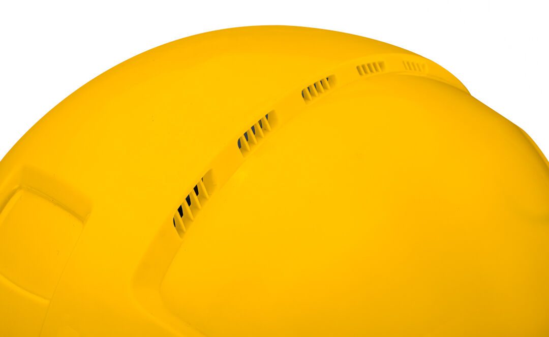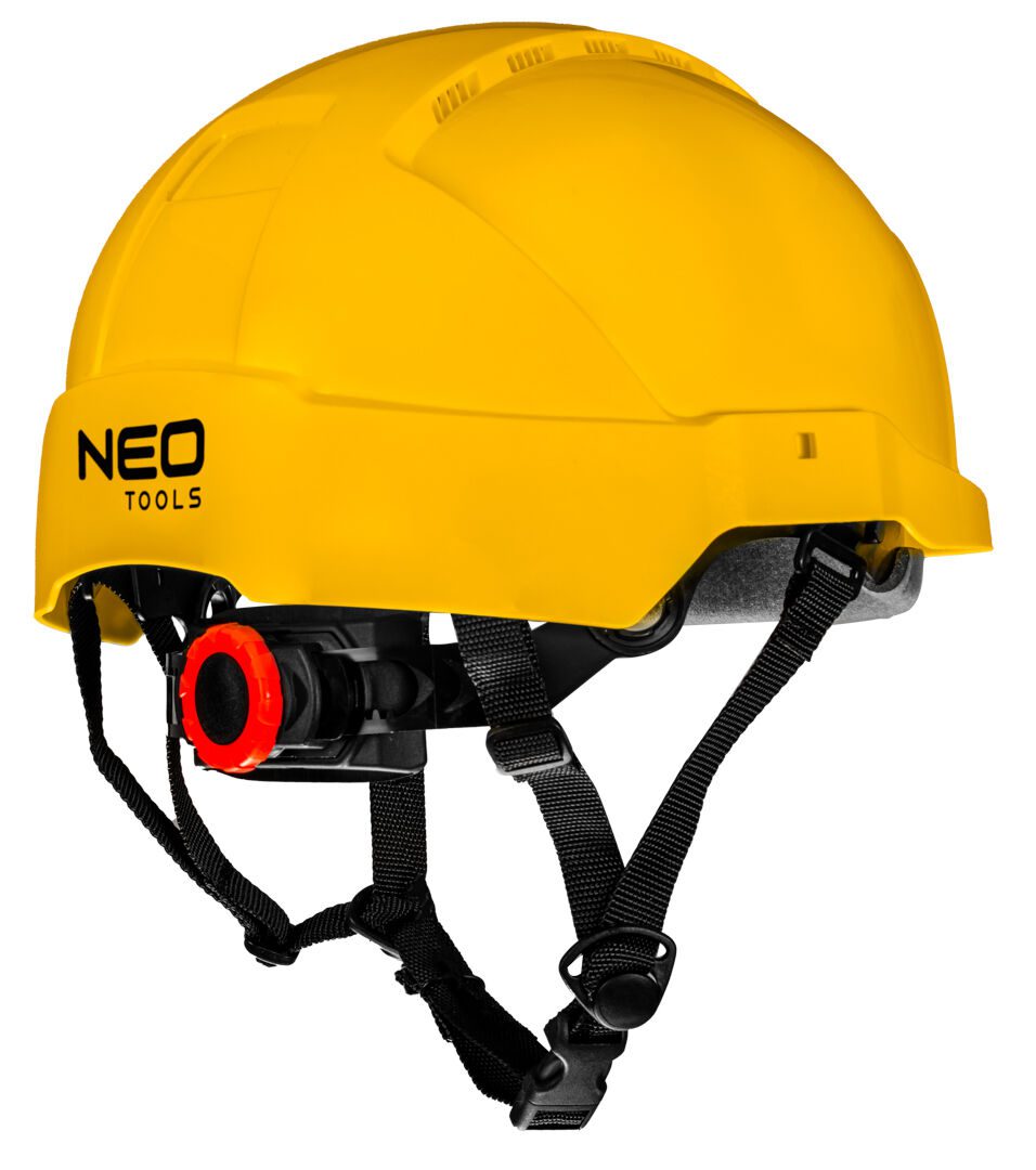 Каска промислова для роботи на висоті, жовта 97-210 від NEO – каска жовтого кольору, призначена для працівників ручної праці. Завдяки невеликій вазі 430 г та польському виробництву, цей виріб забезпечує високу міцність при роботі на висоті. Виготовлена з міцного ABS пластику, вона містить 10 вентиляційних отворів, що дозволяють повітрю вільно циркулювати всередині шолома. Каска складається з поворотного обтюратора, суцільнолитого корпусу шолома та набору ременів (підборідний ремінь, що кріпиться в 4-х точках), несучого ременя (кріпиться до корпусу в 6-ти точках) та нашоломного ременя зі зручним механізмом регулювання, що дозволяє змінювати параметри за допомогою зручної у використанні ручки. Шолом також має велюрову змінну підкладку від поту. Виріб має широкий діапазон регулювання (від 51-63 см). Може використовуватися як при дуже низьких температурах (-30°C), так і в спекотну погоду. Шолом відноситься до II класу захисту. Стійкість до поперечної деформації та ударів також дозволяє використовувати його в будівництві, промисловості та лісовому господарстві. Відмінний захист для працівників в екстремальних умовах.