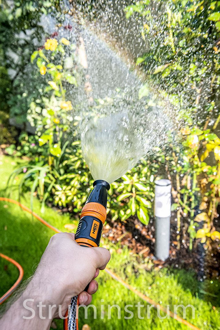 Прямий регульований дощувач 15-700 від NEO призначений для універсального використання в садах, на присадибних ділянках або упорядкованих територіях. Оснащений практичним регулюванням струменя, що дозволяє вибрати сильний, точковий промінь або розсіяний туман. Виготовлений з високоякісного пластику з елементами з м’якої гуми TPR. Спринклер сумісний зі шлангом ½”.