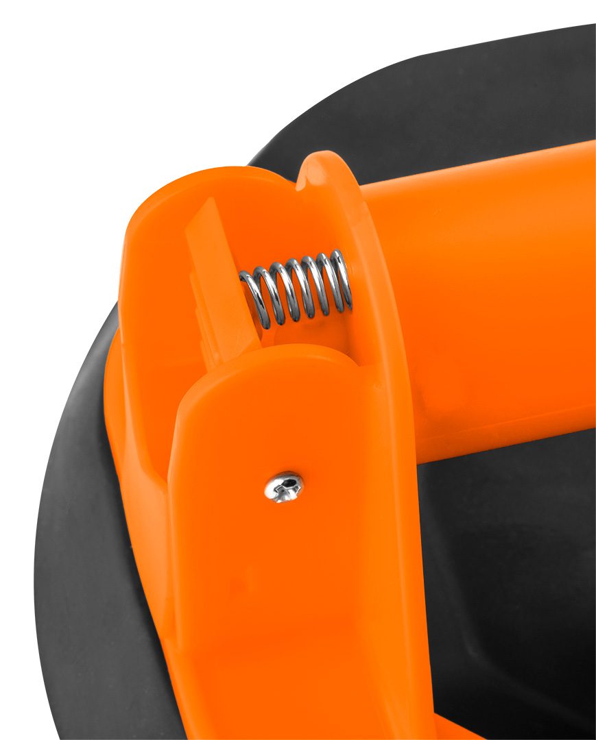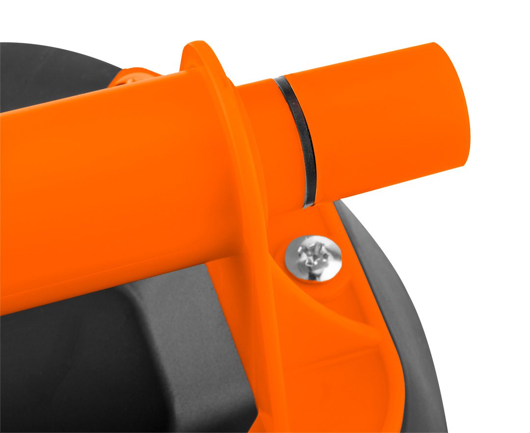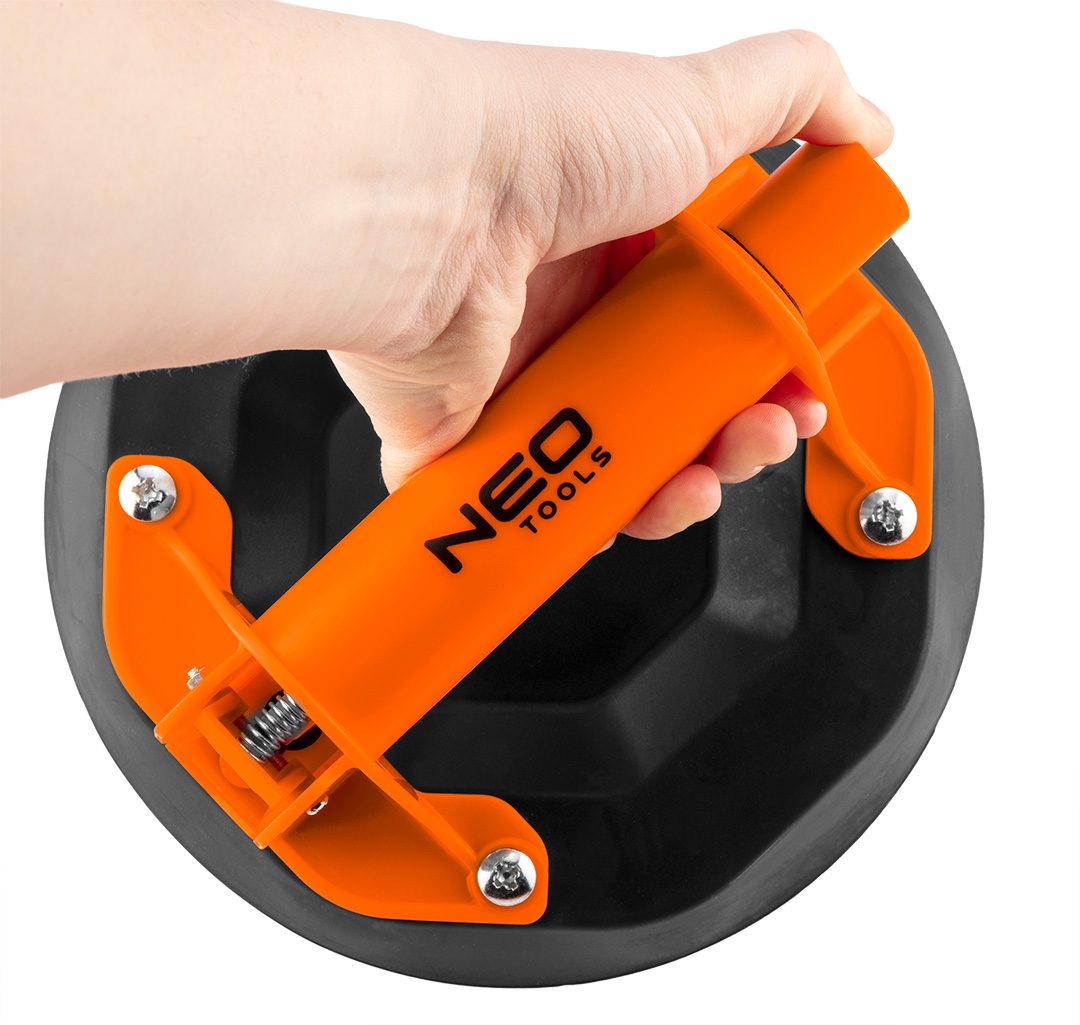 Вакуумна присоска NEO з насосом (арт. 56-800) призначена для плитки та скла. Максимальна вантажопідйомність – 160 кг. Він оснащений вакуумним насосом для більш міцного захоплення та кнопкою для його швидкого розблокування. Присоска також може використовуватися для видалення вм’ятин на кузовах автомобілів. Це універсальний інструмент, який дозволяє безпечно транспортувати та встановлювати вікна, черепицю тощо. Виріб упаковано в чохол для перенесення.