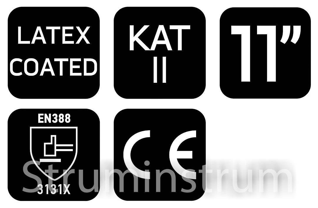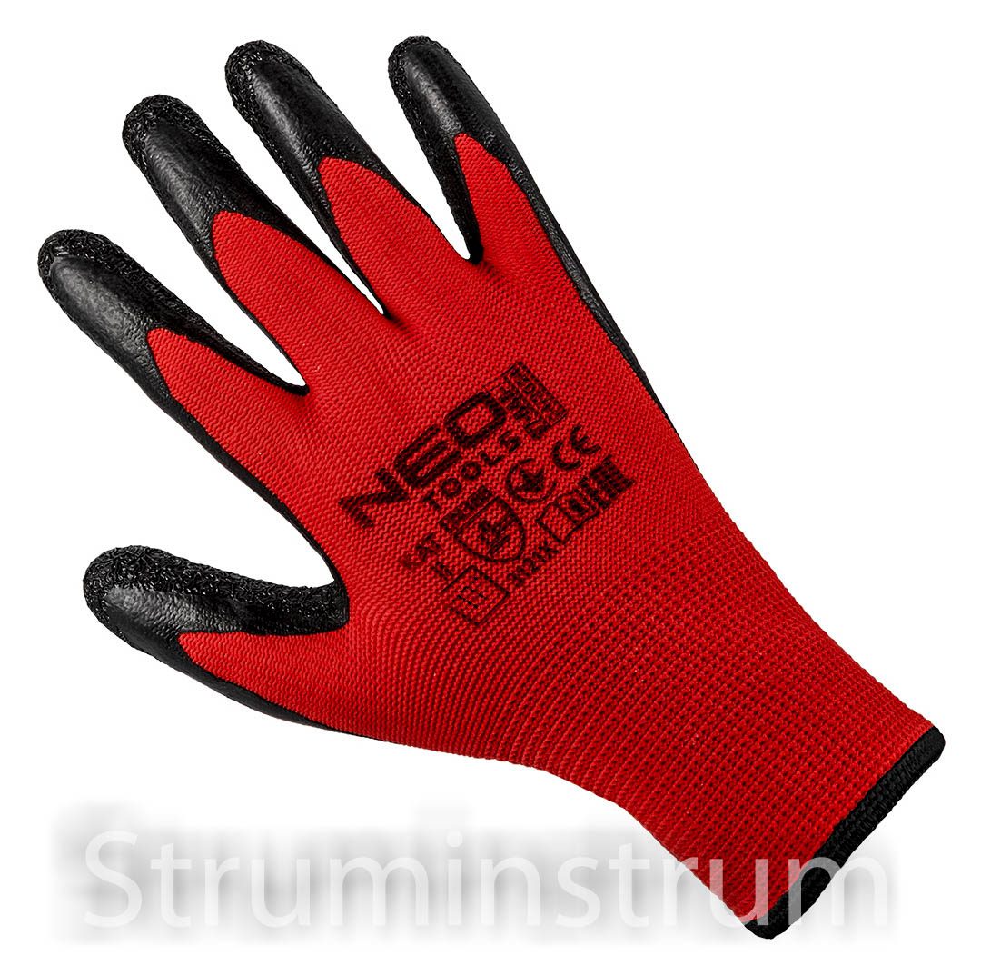 NEO TOOLS 97-645K-11 — міцні та зносостійкі робочі рукавички з поліестеру з латексним покриттям (крінкл). Виготовлені у категорії II, сертифіковані CE за стандартами EN388 та EN420.
