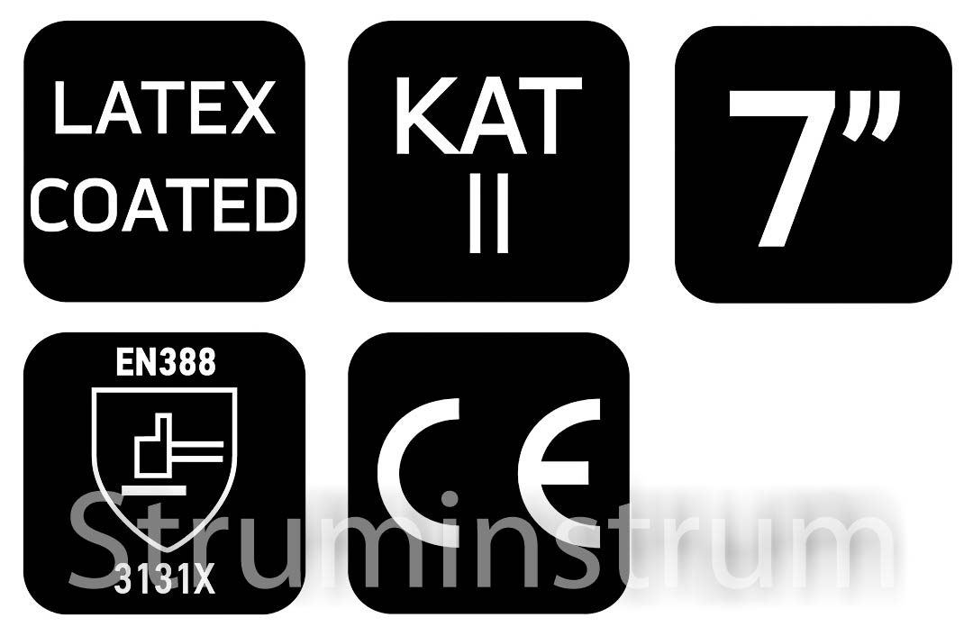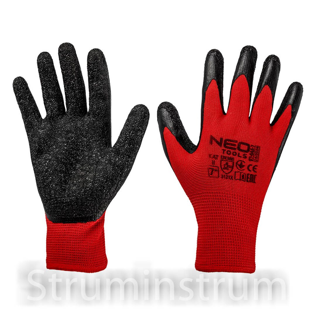NEO TOOLS 97-645K-7 — міцні та зносостійкі робочі рукавички з поліестеру з латексним покриттям (крінкл). Виготовлені у категорії II, сертифіковані CE за стандартами EN388 та EN420.