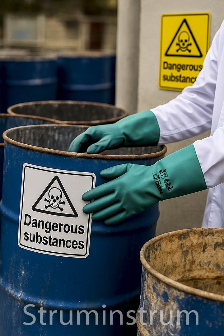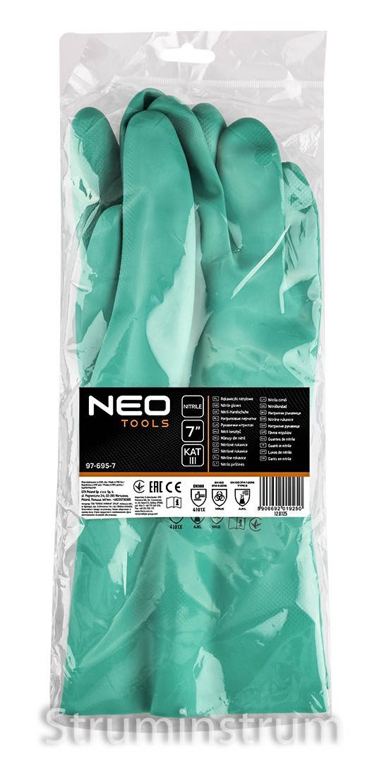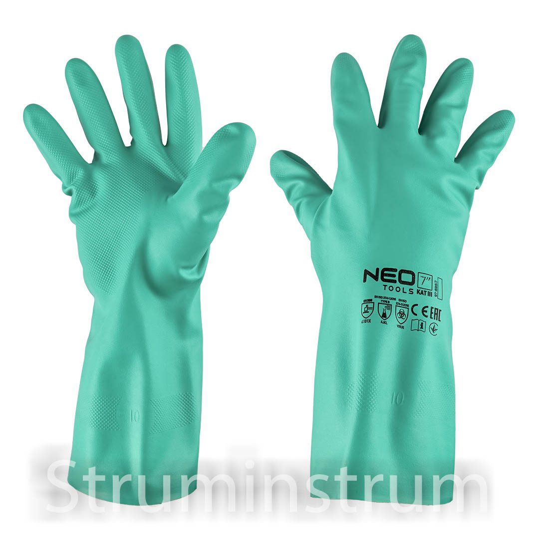 NEO TOOLS 97-695-7 — хімічно стійкі рукавички з міцного нітрилу, категорія III, сертифіковані CE за стандартами EN388, EN374-1 та EN374-5.