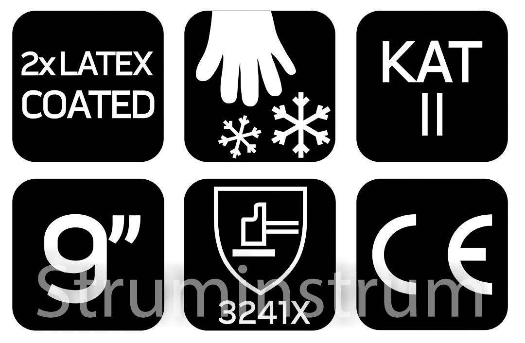 Робочі рукавички AquaWinter 97-614-10 від NEO TOOLS – водонепроникні та утеплені шліфованим поліестером, які підходять для зимових робіт, прибирання снігу, транспортування або холодного зберігання. Рукавички бренду NEO TOOLS мають подвійне латексне покриття (гладка + спінена) і відносяться до категорії II, 3241X, X2X. Сертифіковані за стандартами EN388, EN420 і EN511, вони характеризуються стійкістю до стирання (3 за шкалою від 0 до 4), стійкістю до порізів гострими предметами (2 за шкалою від 0 до 5), стійкістю до розривів (4 за шкалою від 0 до 4), стійкістю до проколів (1 за шкалою від 0 до 4) і стійкістю до порізів відповідно до EN ISO 13997 X. Робочі рукавички NEO TOOLS AquaWinter також стійкі до холодного контакту, дотику і проникнення води. Вони добре сидять в руці і, завдяки спіненої поверхні латексного шару з грубою текстурою, забезпечують надійний захват і обмежене ковзання. Ці водонепроникні робочі рукавички NEO TOOLS просто необхідні в зимові місяці.