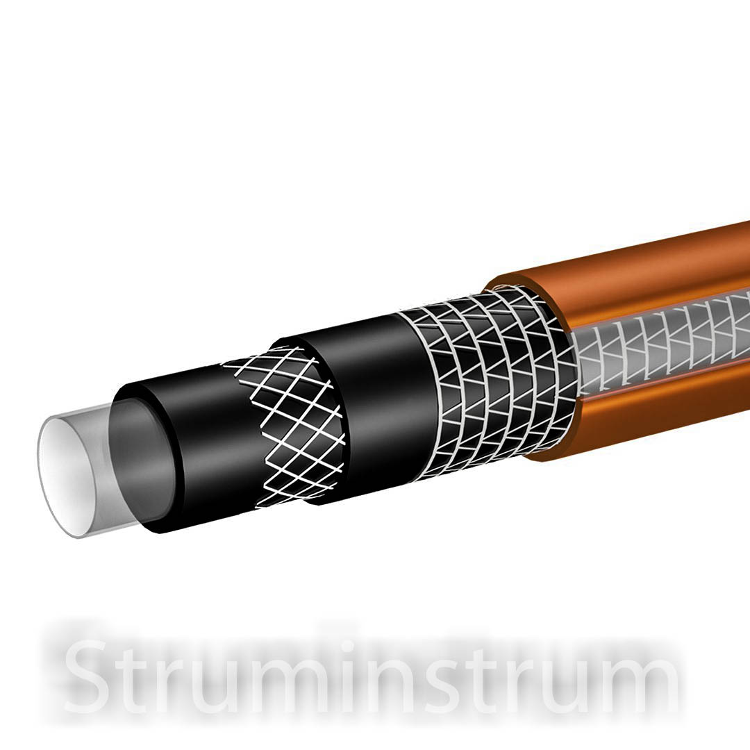 6-шаровий садовий шланг з гнучкого ПВХ, армований поліефірною ниткою, з двома обплетеннями (хрест і трико). Чудово підходить для догляду за малими і великими садовими ділянками, включаючи очищення вуличних меблів та інструментів, незалежно від пори року. Стійкий до накопичення водоростей і УФ-променів і придатний для контакту з харчовими продуктами завдяки шару Food Safe. Зручний у використанні завдяки системі проти скручування