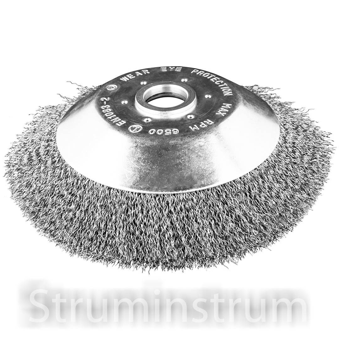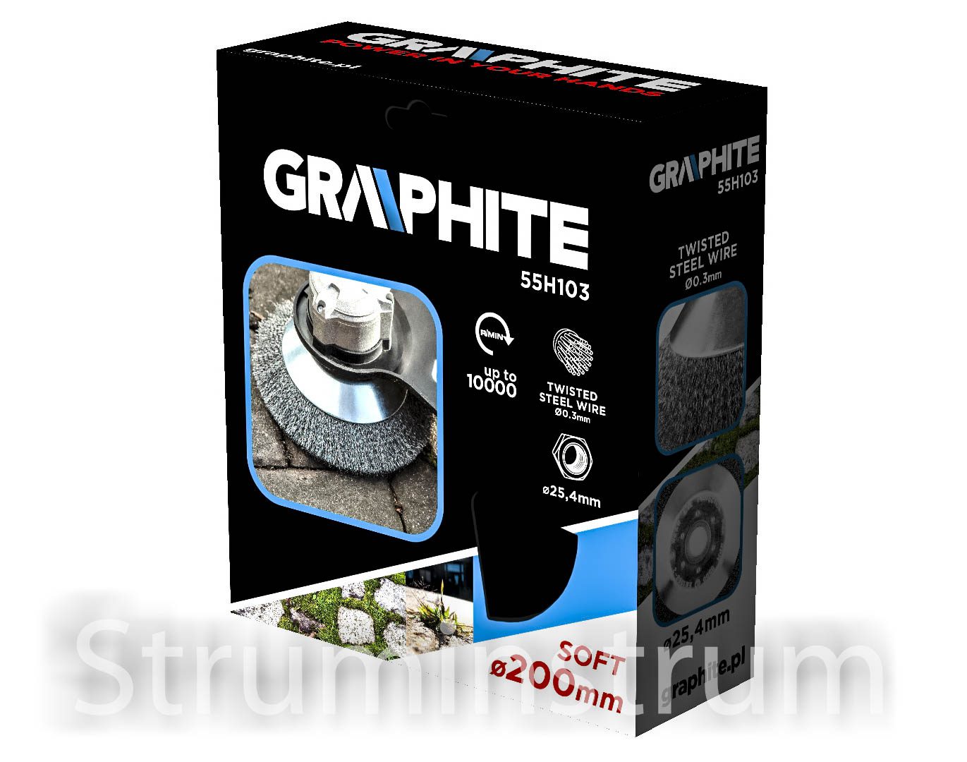 GRAPHITE 55H103 — дротяна щітка для бензокоси діаметром 200 мм з посадковим отвором 25,4 мм. Виконана з хвилястого дроту для ретельного очищення бруківки та металевих поверхонь.