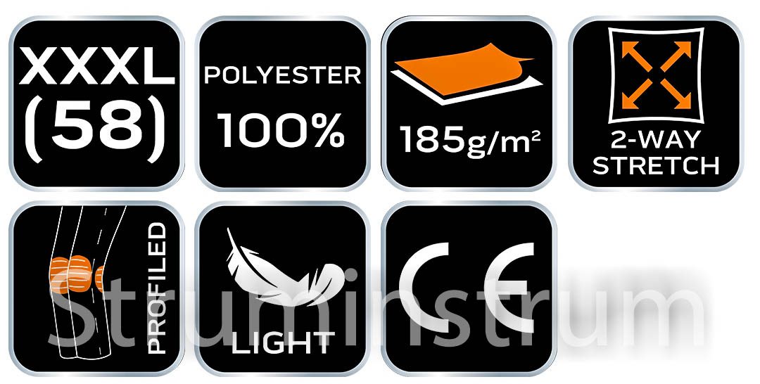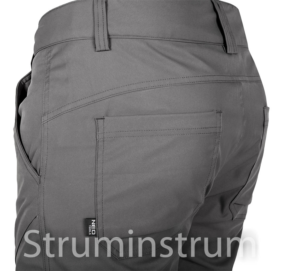 NEO TOOLS 81-297-XXXL — робочі штани з двосторонньої еластичної тканини “cotton touch twill”, 100% поліестер, вага 185 г/м², у сірому кольорі.