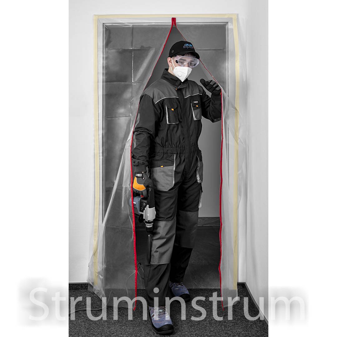NEO 49-801 — пилозахисна завіса для дверних прорізів, виготовлена з товстої, безбарвної та прозорої поліетиленової плівки. Забезпечує ефективний захист приміщення від пилу під час ремонтних робіт.