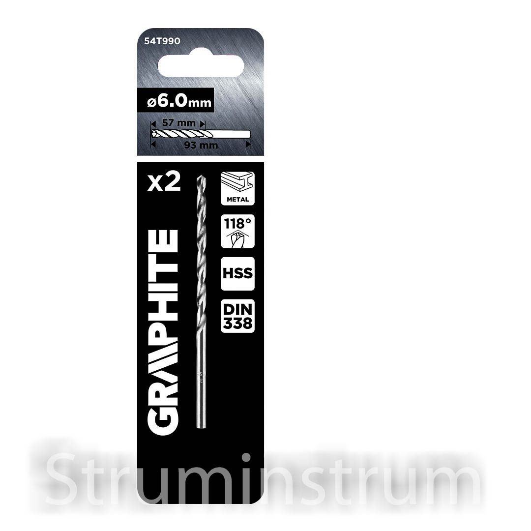 GRAPHITE 54T990 — набір із двох свердел для роботи з металом. Виготовлені зі швидкорізальної сталі HSS, відповідають стандарту DIN 338.