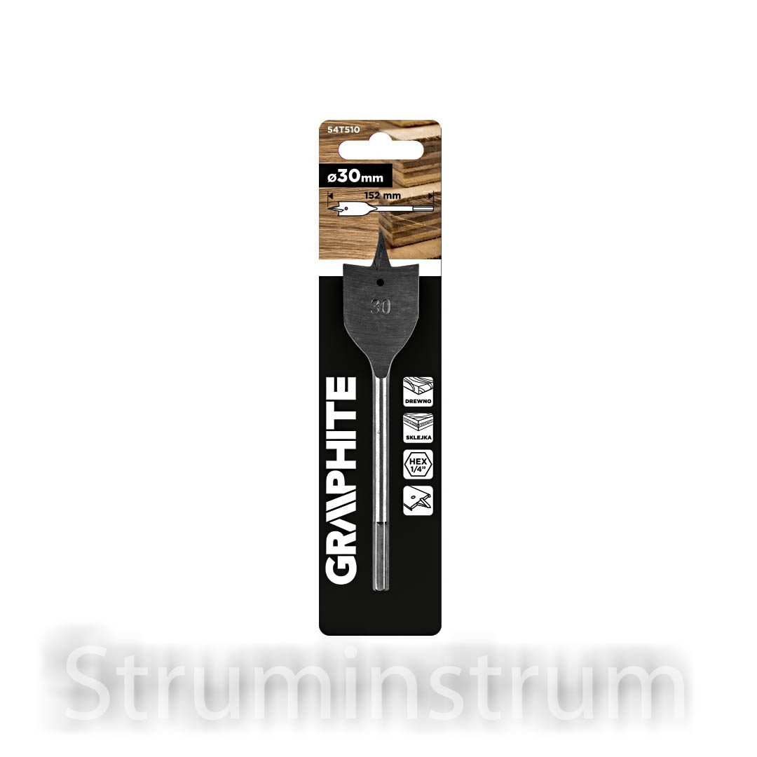 GRAPHITE 54T510 — пір’яне свердло для деревини та фанери, діаметром 30 мм і довжиною 152 мм. Оснащене шестигранним хвостовиком HEX для надійного кріплення у патроні.