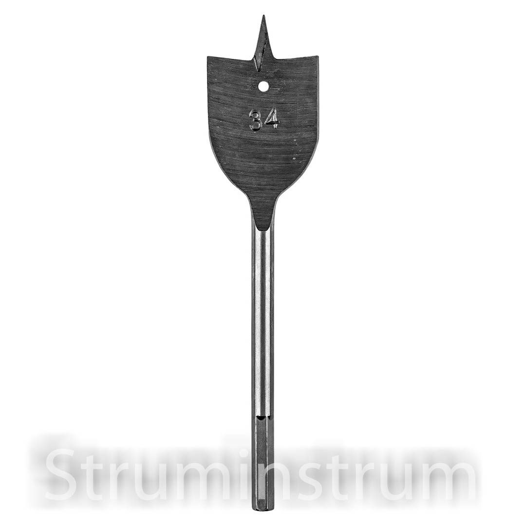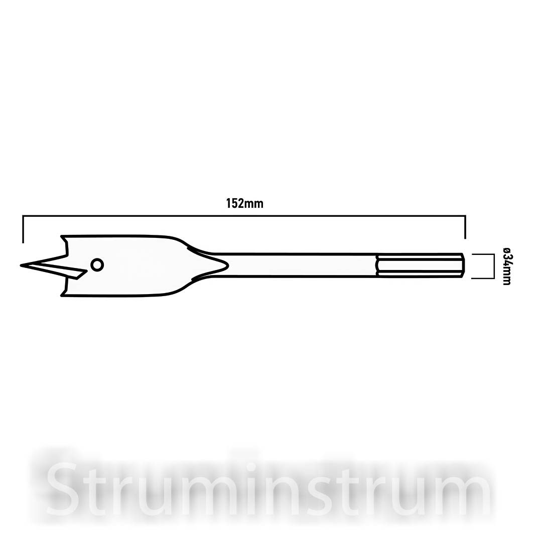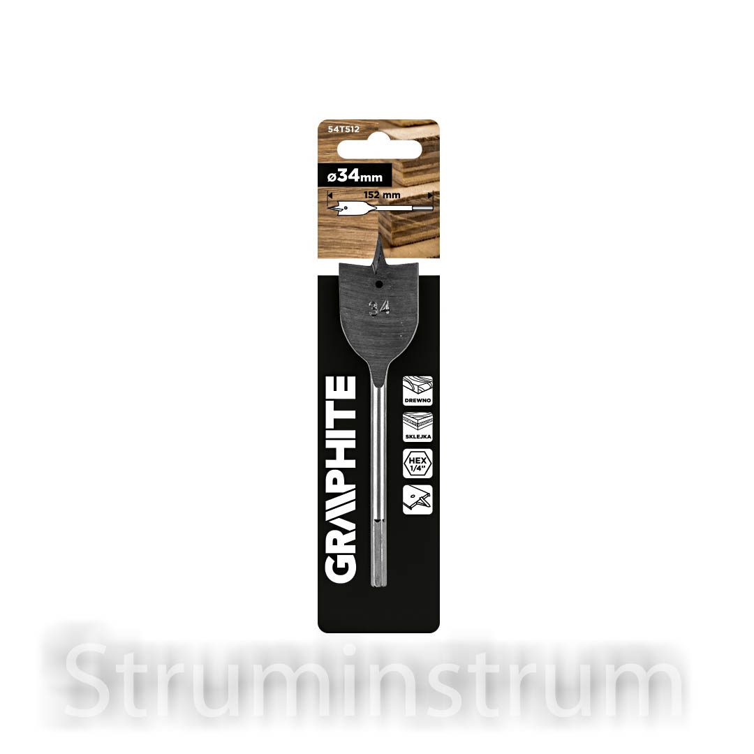GRAPHITE 54T512 — пір’яне свердло для деревини та фанери, діаметром 34 мм і довжиною 152 мм. Оснащене шестигранним хвостовиком HEX для надійного кріплення у патроні.