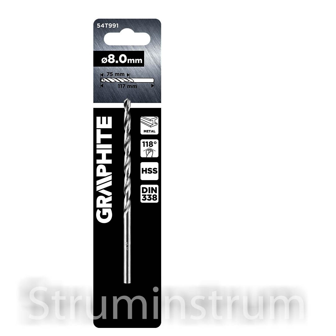 GRAPHITE 54T991 — свердло для роботи з металом. Виготовлене зі швидкорізальної сталі HSS, відповідає стандарту DIN 338.